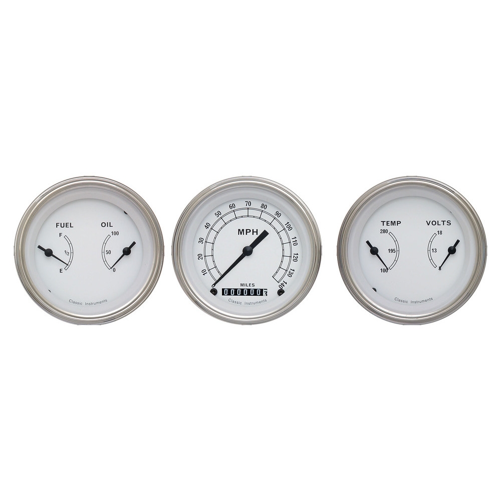The Classic White 3 Gauge Kit includes: 3-3/8" Speedo and 2 Dual gauges. One Dual is Fuel and Oil and the other is Temp and Volt with Stainless Low Step Bezel Curved Glass Lens.