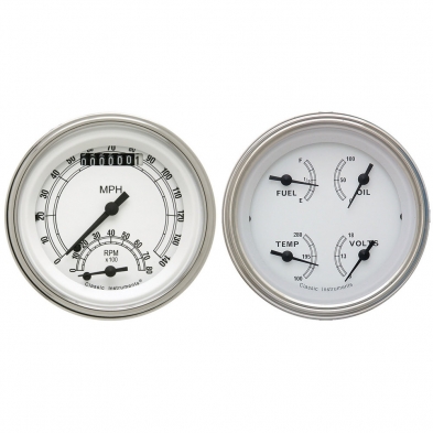 The Classic White 2 Gauge Kit includes 3-3/8" Ultimate Speedometer & Quad with Stainless Low Step Bezels and Curved Glass Lenses. Please Note that the Ultimate Speedometer features a built-in ECM filter signal switch.