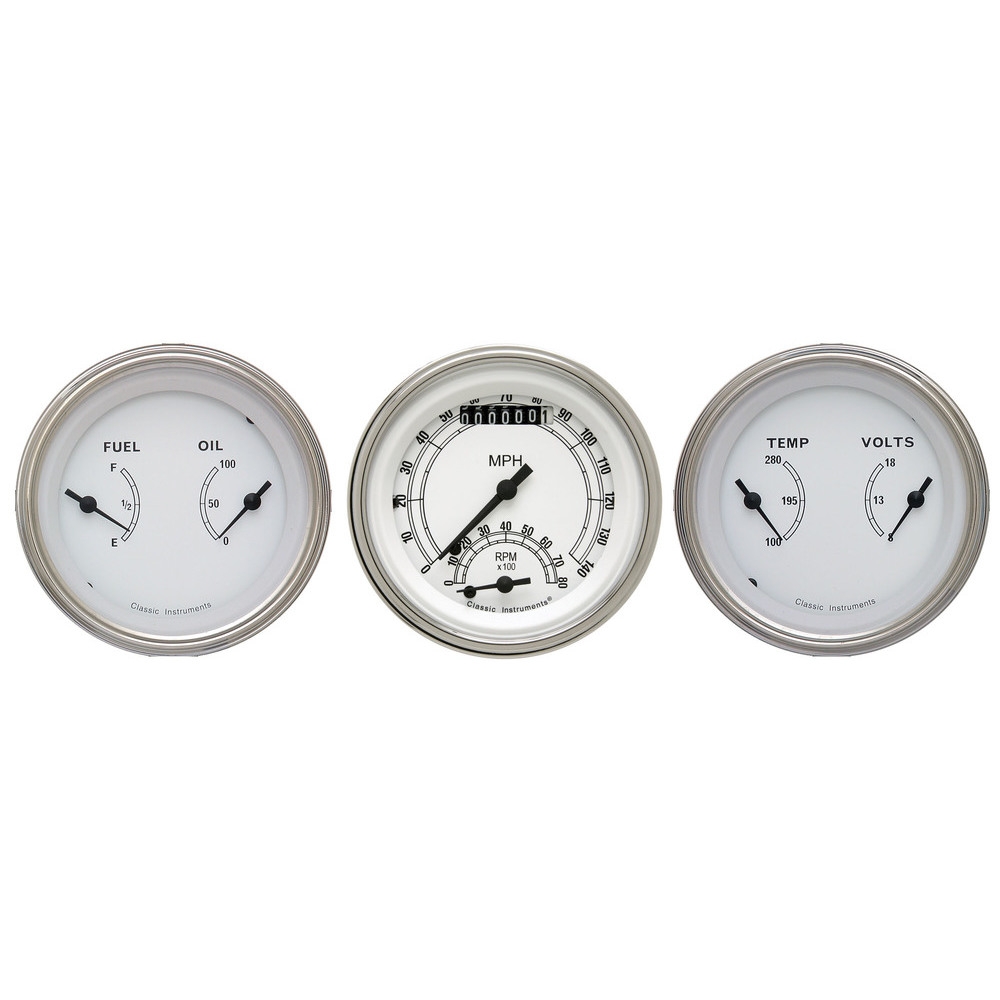 The Classic White 3 Gauge Kit includes 3-3/8" Ultimate Speedometer and 2 Dual Gauges with Stainless Low Step Bezels and Curved Glass Lenses. Please Note that the Ultimate Speedometer features a built-in ECM filter signal switch.