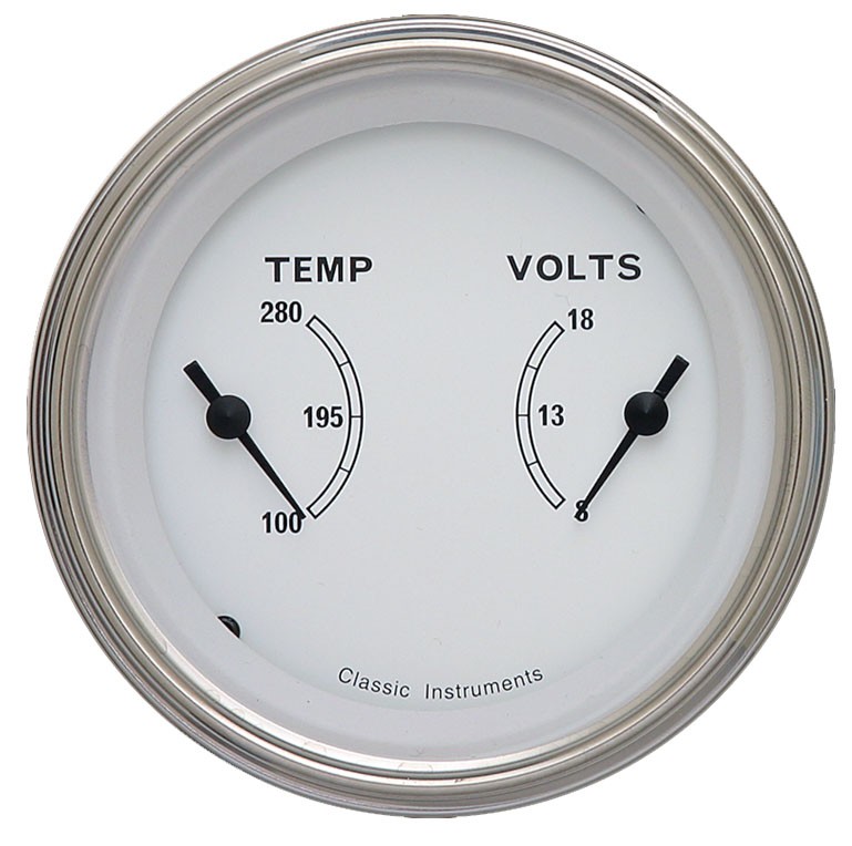 The Classic White 3-3/8" Dual Gauge (Water Temp and Volt) with Stainless Low Step Bezels and Curved Glass Lenses.