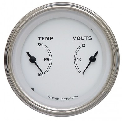 The Classic White 3-3/8" Dual Gauge (Water Temp and Volt) with Stainless Low Step Bezels and Flat Glass Lenses.