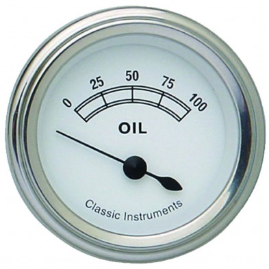 The Classic White 2-1/8" Oil Pressure Gauge with Stainless Low Step Bezels and Flat Glass Lenses.
