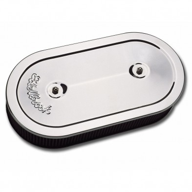 Edelbrock Dual-Quads oval air cleaners clear HEI distributors and all stock components. Edelbrock low profile dual-quad manifolds and others with 6-7/16" carb center-to-center. They come with high-quality 2-1/2" washable, pre-oiled cotton gauze filter for excellent filtration. Overall dimension is 13-1/2" x 7".