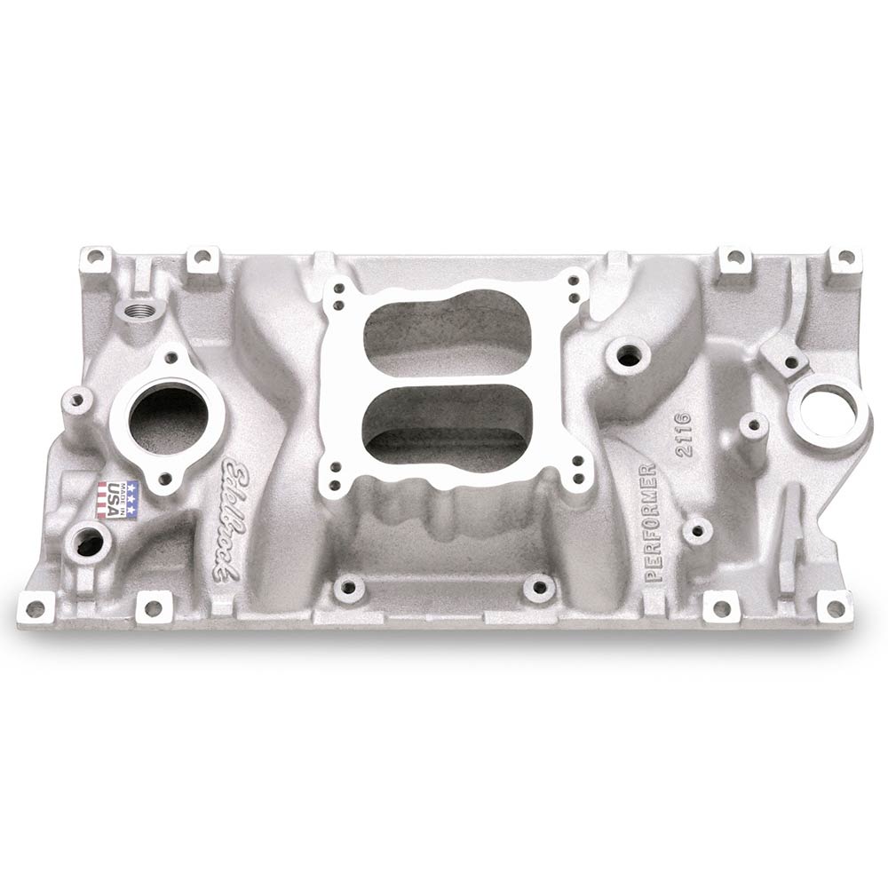 This dual-plane intake is designed for the street rod, industrial ;and engine swap market utilizing 262-400 cid Chevy V8's with 1996 and later Vortec (L31) cast iron or the Edelbrock E-Tec aluminum ;heads. Manifold has provisions for external water bypass and may be used on either Vortec blocks ;or 1995 and earlier blocks. No provision for exhaust heated chokes. Accepts both square-bore and spread-bore carbs and late model water neck, alternator, HEI and air conditioning brackets. Will not fit under stock Corvette hood. ;