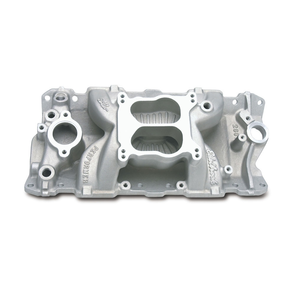 Designed for 1955-86 262-400 c.i.d. small-block Chevy's, the Performer Air-Gap features the air-gap design for the ultimate street performance in the idle to 5500 rpm range. This design features an open air space that separates the runners from the hot engine oil resulting in a cooler, denser charge for more power. High-velocity runners deliver excellent throttle response throughout the power band. The great looks of the Performer Air-Gap along with the solid idle to 5500 rpm performance makes this an ideal choice for street rods and street machines. Performer Air-Gap #2604 is for 1987-95 cast iron heads with canted center bolt holes. No provision for exhaust heated chokes or exhaust crossover. Fits spread-bore or square-bore carburetors. Will not fit under stock Corvette hood.