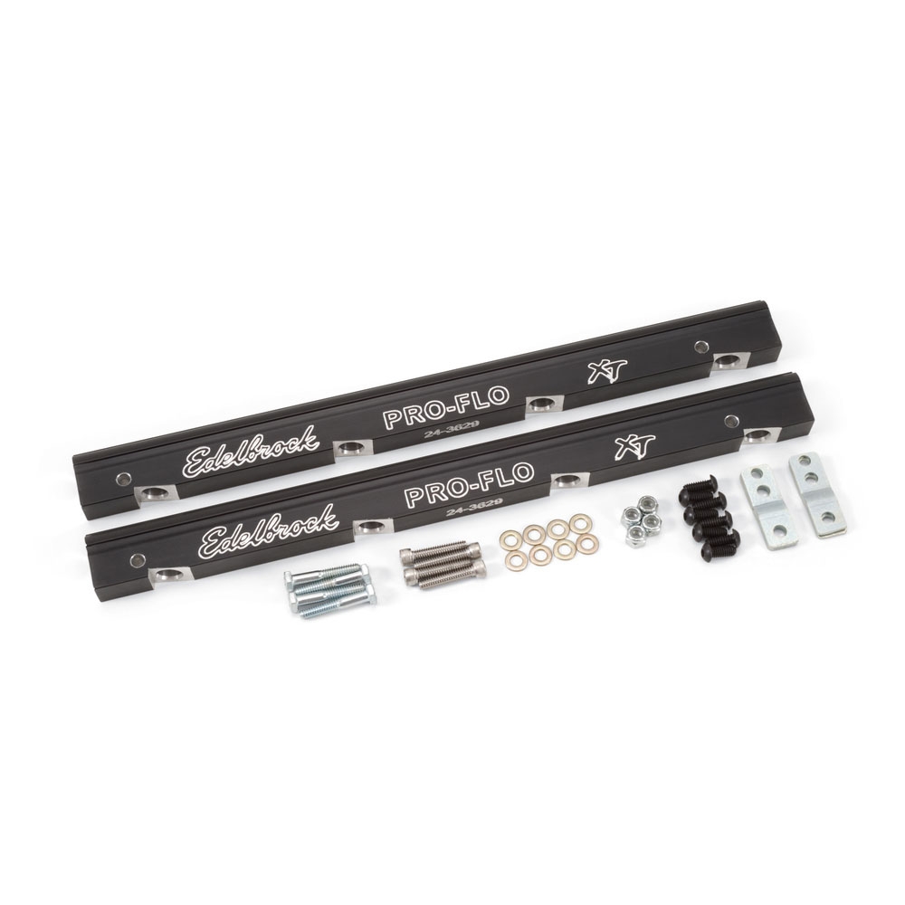 All Edelbrock fuel rails are machined from high quality extruded aluminum. Each kit includes fuel rails, stands and mounting hardware. Fuel fittings, crossover line and regulator not included. Rails have a Black Anodized Finish and -6 AN inlet/outlets.