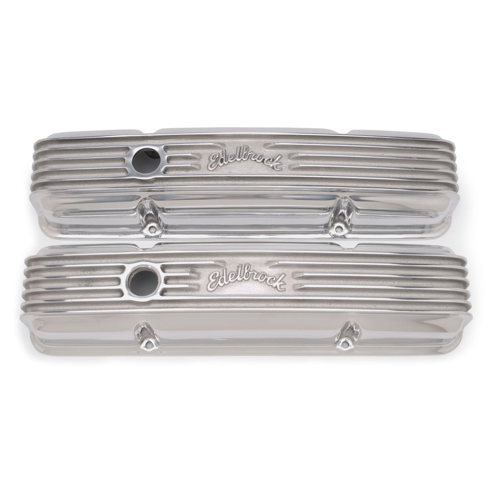Classic Series Tall Valve Covers are designed for Chevy 262-400 V8 1959-86 ;applications. Edelbrock first made these aluminum valve covers in the late '50s and they're still a classic. Made of heavy-gauge sand-cast aluminum, Overall height of 3.5" is measured from base to top at the highest point. Come with oil fill hole.