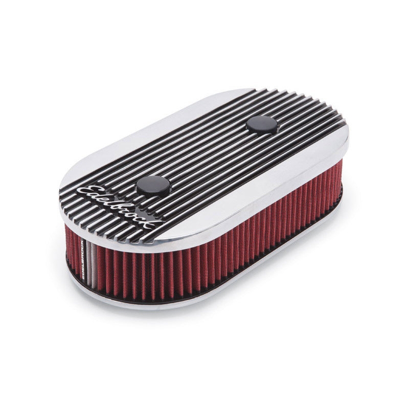 This line of accessories features a design that is influenced by the original Elite Series originally released in 1985, but with a new modern take on this classic look. They're made from heavy-gauge, die-cast aluminum and are finished off with a show quality high luster polished finish. The raised fins are accented by a contrast gloss black finish between the fins for the definitive look. The Elite II round air cleaners fit all popular 5-1/8" diameter carburetors and include a black anodized knurled nut. They come with a high-quality 3" pre-oiled, washable and reusable Pro-Flo Universal filter with the exclusive Pro-Charge trade; clean strip for easy maintenance and excellent filtration. The oval air cleaners are designed to fit Edelbrock single- and dual-quad applications and should clear HEI distributors and stock parts. They come with high-quality 2-1/2" washable, pre-oiled reusable filter for excellent filtration. Overall oval air cleaner dimensions are 13-5/8" x 7-3/16" x 3.5" high.