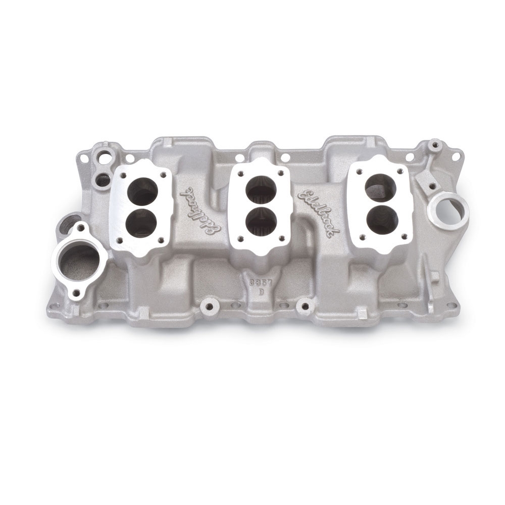 C-357-B Triple-Deuce intake manifold is designed for 1955-86 262-400 c.i.d. small-block Chevys. This manifold has a balanced 180-degree firing order port runner arrangement. It contains an exhaust gas heat crossover and offers excellent performance potential. Has machined front oil filler tube pad with boss and is machined for 4-bolt carburetors. Carb center-to-center: 5-1/2". INSTALLATION NOTES: bull; Manifold ht: A-3.9", B-4.6; bull; Carb pad height: 4.25" bull; Carb recommendations: Contact www.HotRodCarbs.com bull; Port exit dimensions: 1.12" x 1.87" bull; Recommended intake gasket: Edelbrock # 7201. bull; Use RTV sealant to properly seal end seals, such as Edelbrock High Temp Silicone sealant # 1076, DO NOT USE END SEALS GASKETS. bull; Sealant must be used on intake bolt threads if the threads extend into lifter valley or coolant passage. bull; NPT/Pipe thread fittings require the use of Teflon tape or paste on threads to ensure proper seal. bull; DO NOT OVER TIGHTEN NPT/Pipe fittings, this may cause the aluminum to crack around the fitting boss. NPT/Pipe thread is a tapered thread. bull; Hardened washers Must be used with intake bolts to ensure proper torque and prevent galling of the aluminum. bull; H.E.I. will not fit. bull; Carb center-to-center distance: 5-1/2" bull; Carb pad machined for 4-bolt carburetors bull; Even though manifolds are compatible with EGR systems, this does not mean they are legal for use on emissions controlled vehicles.