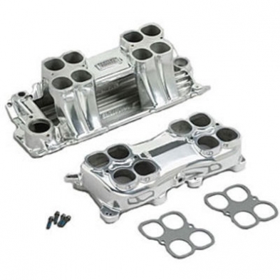 Street Tunnel Ram intake manifold is designed for 302-327-350-400 c.i.d. small-block Chevy V8's operating below 7500 rpm where low-end torque is not a prime factor. Will not fit 1987 and later cast iron heads. Use with cam kit #5002 for low-end torque or cam kit #7102 for top-end power. INSTALLATION NOTES: bull; Top has vacuum outlet for power brakes bull; Manifold will accept forward and sideways mounted carbs bull; Distance from carb center to carb center: 8.875" bull; Carb recommendations: Edelbrock Performer Series # 1404 500 cfm or Edelbrock AVS2 Series # 1902 500 cfm, for forward mount only. Holley # 0-9776 450 cfm for sideways mounted only. bull; H.E.I. ignition will not clear manifold bull; Recommended intake gasket: Edelbrock # 7201 bull; Manifold height (top with bottom): A-9.00", B-9.60"; Carb pad height: 9.30" bull; Port exit dimensions: 1.12" x 2.12" bull; Use RTV sealant to properly seal end seals, such as Edelbrock High Temp Silicone sealant # 1076, DO NOT USE END SEALS GASKETS. bull; Hardened washers Must be used with intake bolts to ensure proper torque and prevent galling of the aluminum. bull; Sealant must be used on intake bolt threads if the threads extend into lifter valley or coolant passage. bull; NPT/Pipe thread fittings require the use of Teflon tape or paste on threads to ensure proper seal. bull; DO NOT OVERTIGHTEN NPT/Pipe fittings, this may cause the aluminum to crack around the fitting boss. NPT/Pipe thread is a tapered thread. bull; Carburetor size (CFM) should be selected based on your specific engine combination.