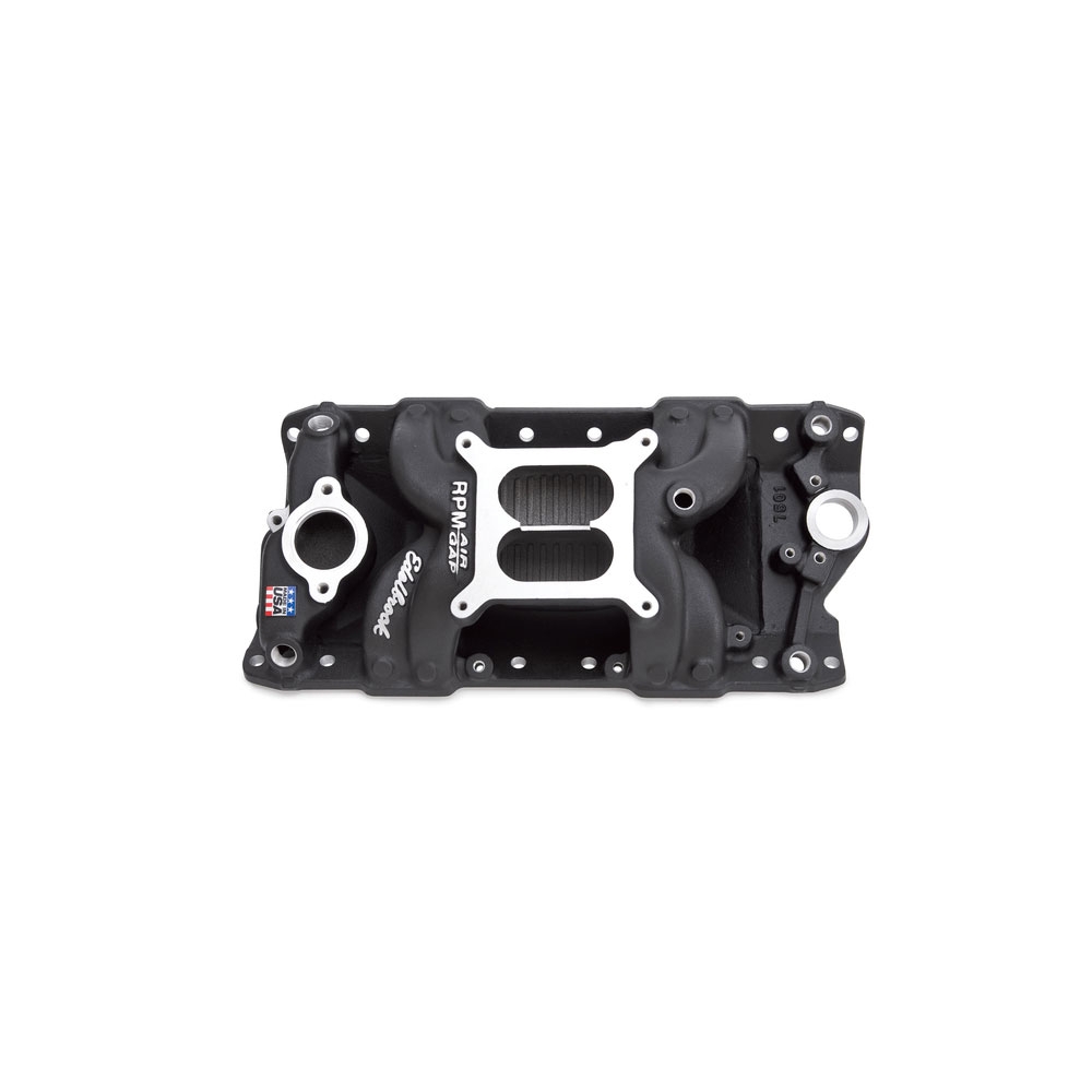 RPM Air-Gap intake manifold is designed for 1955-86 262-400 c.i.d. Chevrolet V8 applications. The air-gap design features an open air space that separates the runners from the hot engine oil resulting in a cooler, denser charge for more power. INSTALLATION NOTES: bull; Manifold ht: A-4.20", B-5.25" (.70" taller than # 2101) bull; Carb pad height: 4.27" bull; Carb recommendations: Edelbrock AVS2 or Performer Series 650-800 cfm. Use bracket # 8031 or # 8036 for 1972-78. bull; Port exit dimensions: 1.14" x 1.95" bull; Recommended intake gasket: Edelbrock # 7201. bull; Use RTV sealant to properly seal end seals, such as Edelbrock High Temp Silicone sealant # 1076, DO NOT USE END SEALS GASKETS. bull; Use # 8504 Edelbrock bolt kit bull; Sealant must be used on intake bolt threads if the threads extend into lifter valley or coolant passage. bull; NPT/Pipe thread fittings require the use of Teflon tape or paste on threads to ensure proper seal. bull; DO NOT OVERTIGHTEN NPT/Pipe fittings, this may cause the aluminum to crack around the fitting boss. NPT/Pipe thread is a tapered thread. bull; Hardened washers Must be used with intake bolts to ensure proper torque and prevent galling of the aluminum. bull; Will not fit under stock Corvette hood. bull; Proper installation is the responsibility of the installer. Improper installation will void your warranty and may result in poor performance and engine or vehicle damage.
