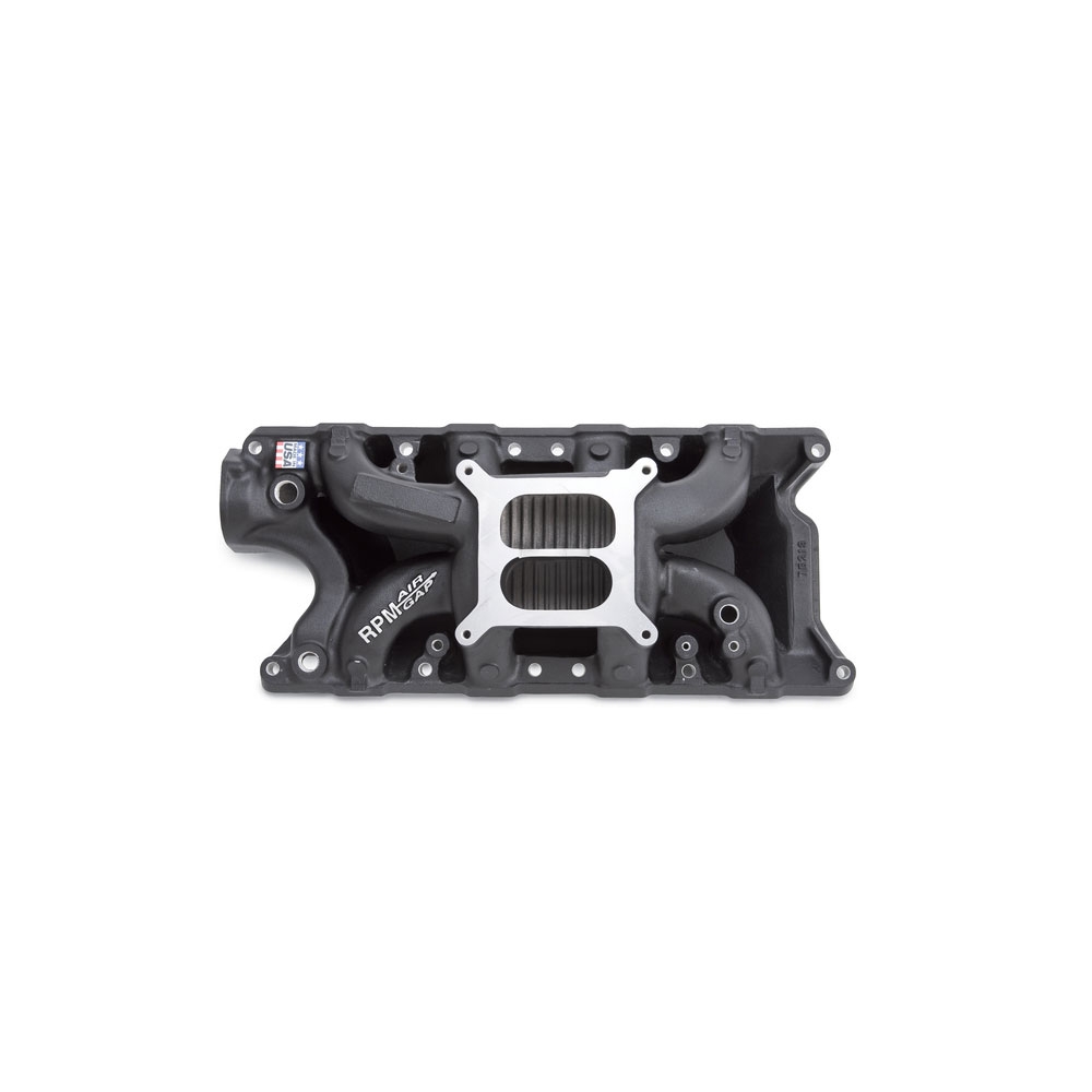 RPM Air-Gap intake manifold is designed for street 289 302-347 c.i.d. Ford V8 applications. The Air-Gap trade; design features an open air space that separates the runners from the hot engine oil resulting in a cooler, denser charge for more power. Includes nitrous bosses. No provision for exhaust heated chokes and no exhaust crossover. Edelbrock carbs will work with Ford automatic overdrive trans (AOD) when used with Lokar bracket SRK-4000. INSTALLATION NOTES: bull; Will not fit 255 c.i.d. V8 bull; Recommended intake gasket: Edelbrock # 7220 bull; Manifold Height: A-4.30", B-5.50" bull; Carb pad height: 4.90" bull; Carb recommendations: Edelbrock AVS2 or Performer Series 600-800 cfm. For automatic transmissions use # 1483 and # 1490 or # 1844. bull; Port exit dimensions: 1.04" x 1.85" bull; Use RTV sealant to properly seal end seals, such as Edelbrock High Temp Silicone sealant #1076, DO NOT USE END SEALS GASKETS. bull; Hardened washers Must be used with intake bolts to ensure proper torque and prevent galling of the aluminum.