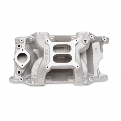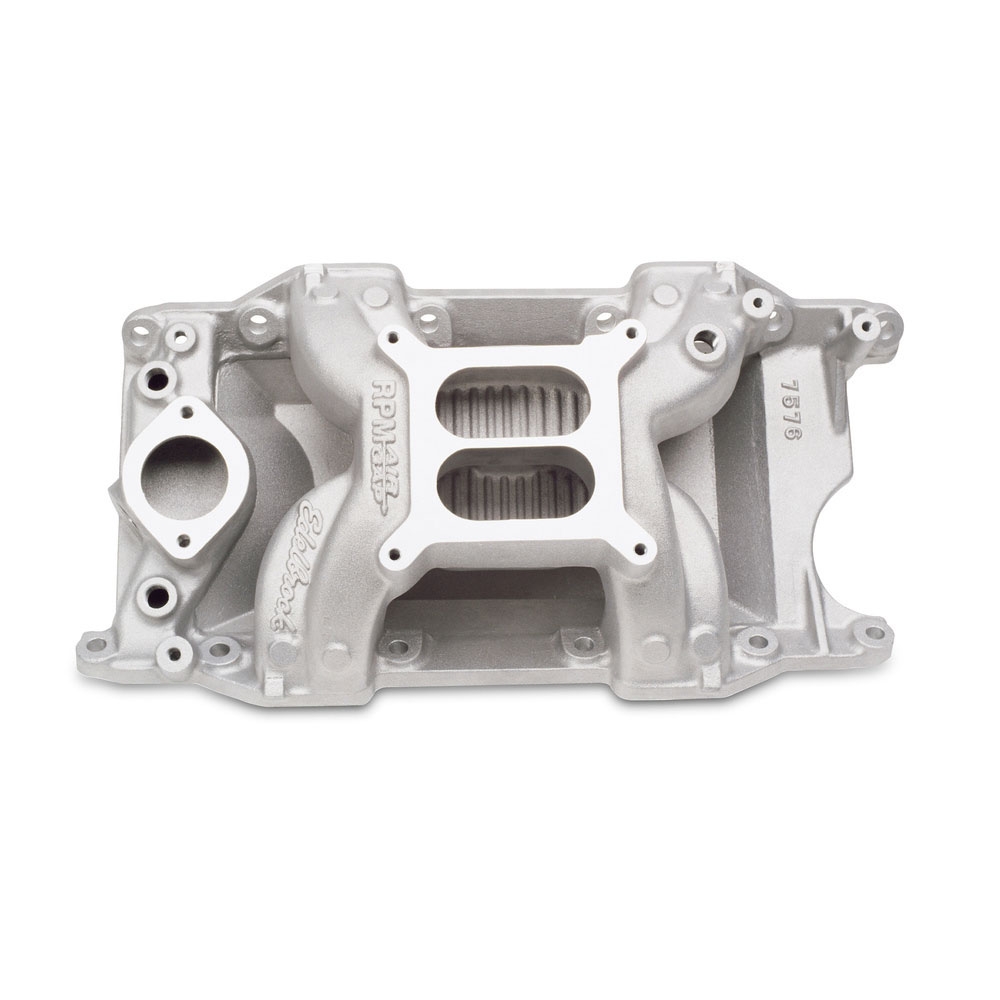 RPM Air-Gap intake manifold is designed for 340-360 c.i.d. Chrysler V8's and 318 c.i.d. engines with 340-360 cylinder heads. The Air-Gap design features an open air space that separates the runners from the hot engine oil resulting in a cooler, denser charge for more power. Accepts 1975 and earlier waterneck only. No provision for exhaust heated chokes and no exhaust crossover. Will not accept stock Thermo-Quad carburetor. Will not fit 1992 and later Magnum engines. Includes nitrous bosses. INSTALLATION NOTES: bull; Recommended intake gasket: Edelbrock # 7276, Fel-Pro # 1213, Chrysler # 4397642 (or equivalent) for 340 and 360 bull; Manifold height: A-4.9", B-5.8" bull; Carb pad height: 5.35" bull; Carb recommendations: Edelbrock AVS2 or Performer Series 650-800 cfm. Use # 1481 or # 1843 throttle/transmission lever kit. bull; Port exit dimensions: .98" x 2.16" bull; 1979 and later rotary A/C compressor will not clear waterneck bull; Use RTV sealant to properly seal end seals, such as Edelbrock High Temp Silicone sealant # 1076, DO NOT USE END SEALS GASKETS. bull; Hardened washers Must be used with intake bolts to ensure proper torque and prevent galling of the aluminum.