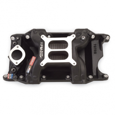 RPM Air-Gap intake manifold is designed for 340-360 c.i.d. Chrysler V8's and 318 c.i.d. engines with 340-360 cylinder heads. The Air-Gap design features an open air space that separates the runners from the hot engine oil resulting in a cooler, denser charge for more power. Accepts 1975 and earlier waterneck only. No provision for exhaust heated chokes and no exhaust crossover. Will not accept stock Thermo-Quad carburetor. Will not fit 1992 and later Magnum engines. Includes nitrous bosses. INSTALLATION NOTES: bull; Recommended intake gasket: Edelbrock # 7276, Fel-Pro # 1213, Chrysler # 4397642 (or equivalent) for 340 and 360 bull; Manifold height: A-4.9", B-5.8" bull; Carb pad height: 5.35" bull; Carb recommendations: Edelbrock AVS2 or Performer Series 650-800 cfm. Use # 1481 or # 1843 throttle/transmission lever kit. bull; Port exit dimensions: .98" x 2.16" bull; 1979 and later rotary A/C compressor will not clear waterneck bull; Use RTV sealant to properly seal end seals, such as Edelbrock High Temp Silicone sealant # 1076, DO NOT USE END SEALS GASKETS. bull; Hardened washers Must be used with intake bolts to ensure proper torque and prevent galling of the aluminum.