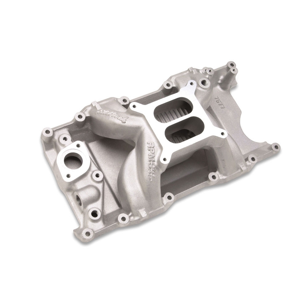 RPM Air-Gap Magnum intake manifold is designed for 1992 amp; later 5.2L (318 c.i.d.) and 1993 amp; later 5.9L (360 c.i.d.) Chrysler Magnum V8 applications. The RPM Air-Gap manifold allows the use of a carburetor for engine swaps in early muscle cars and street rods for performance in the 1500 to 6500 rpm range. The Air-Gap design features an open air space that separates the runners from the hot engine oil resulting in a cooler, denser charge for more power. Match with Performer RPM Magnum cylinder heads #61779 for maximum performance. INSTALLATION NOTES: bull; Recommended intake gasket: Edelbrock # 7277, Mopar Performance # 4876049 (or equivalent) bull; Manifold height: A-4.75", B-5.8" bull; Carb pad height: 5.27" bull; Carb recommendations: Edelbrock AVS2 or Performer Series 650-800 cfm. Use # 1481 or # 1843 throttle/transmission lever kit. bull; Port exit dimensions: 1.08" x 2.10" bull; Accepts Magnum water neck only. bull; Use RTV sealant to properly seal end seals, such as Edelbrock High Temp Silicone sealant # 1076, DO NOT USE END SEALS GASKETS. bull; Hardened washers Must be used with intake bolts to ensure proper torque and prevent galling of the aluminum.