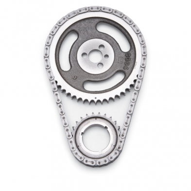 Performer-Link timing chain is for use with Edelbrock or stock cams. They have a solid-bushing chain for a true bearing surface that rolls with the sprockets, eliminating chain stretch. Cam sprockets are made from 35,000 psi tensile strength cast iron. Crank sprockets are made from billet SAE-1144 steel and induction heat treated. Four Performer-Link sets are stock replacement parts and 50-state legal. All other sets have three keyway setting points to ensure accurate timing selection for early or late-model vehicles. Performer-Link timing sets are not for use above 6500 rpm bull; Performer roller chain sets are engineered to operate up to 6500 rpm. bull; Never hammer directly on chain or sprockets. You can crack the hardened links and pins and cause early failures. bull; Use a sleeve for installations that require hammering, a brass drift punch may be used if you carefully alternate blows on either side of the sprocket to avoid cocking. bull; Never stretch the chain with a screwdriver. bull; Check for clearance between the timing chain and block and between the chain and front cover before reassembly. bull; Be sure that both cam and crank sprockets are exactly in line with each other. Misalignment can cause chain to break.
