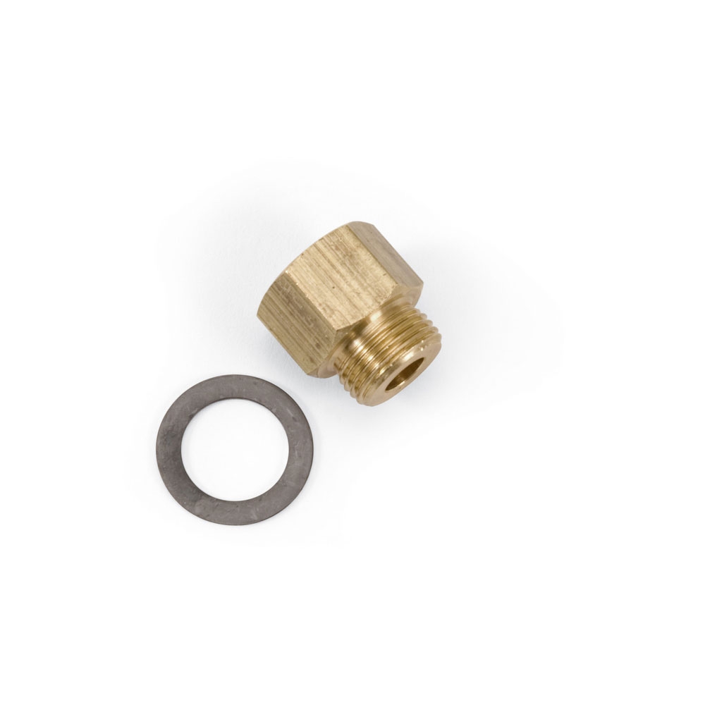 Inverted Flare (3/8;) Fuel Fitting for Edelbrock Square-Bore amp; AFB Carbs. The fitting comes with a sealing washer and has 5/8"-20 threads.