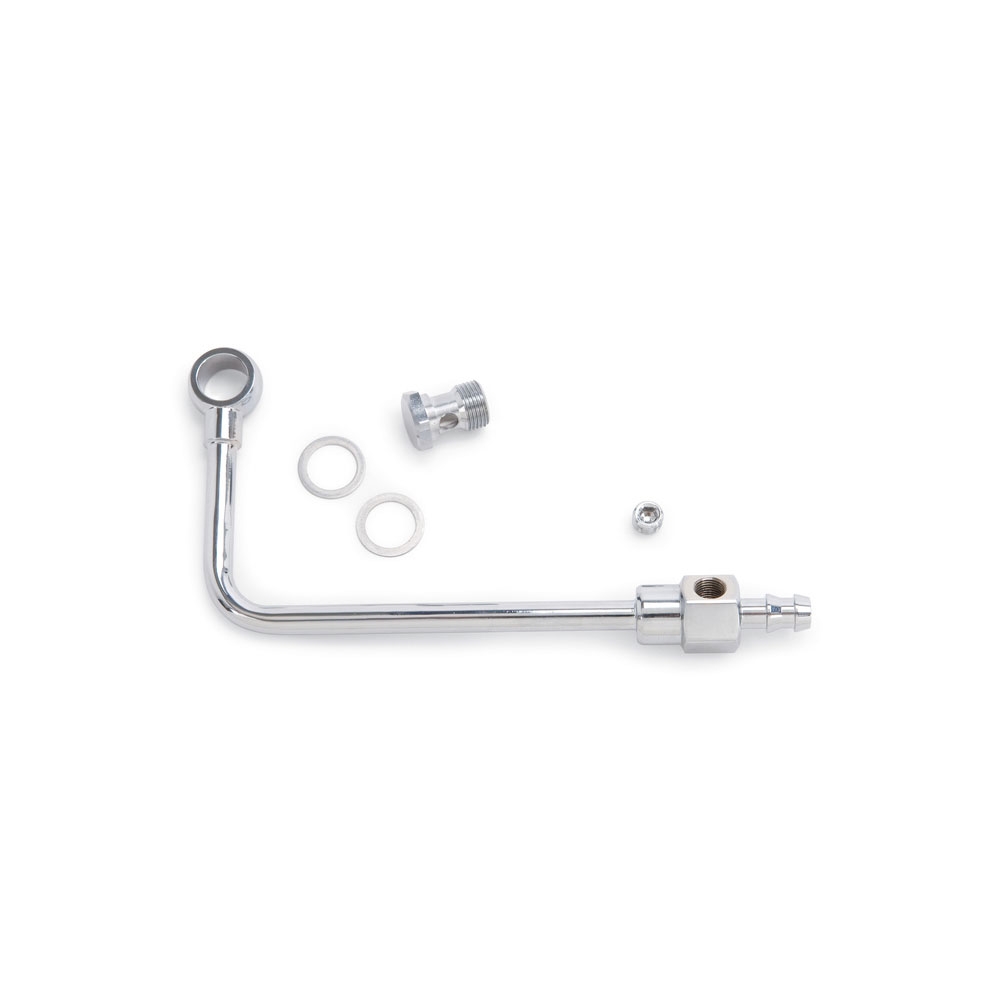 Chrome Steel Fuel Inlet for Edelbrock carburetors provides a clean and custom plumbing solution. The drop-down design routes the fuel line on the right-hand (passenger side) of the carburetor below the linkage and choke housing. Includes a barbed end for a push-on 3/8" rubber fuel line. The Edelbrock #8126 is manufactured of plated steel and include a 5/8" -20 threaded banjo bolt with gaskets.