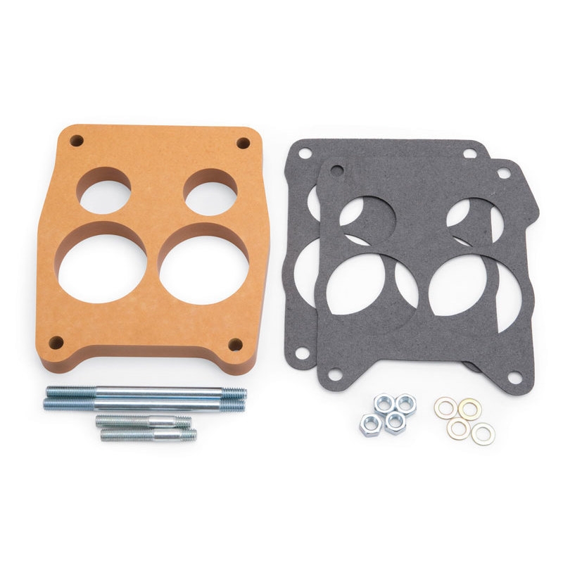3/4" heat insulator spacer kit for Edelbrock 94 Series and Stromberg reg; 97 3-bolt carburetors. The black wood laminate fiber spacer is ideal for reducing heat transfer from the intake manifold to the carburetor. Includes all necessary hardware for a complete installation.