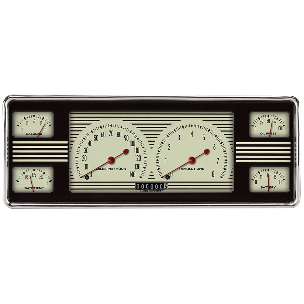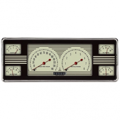 The 1940 Ford Direct-Fit package is available in four different graphic styles which include an Original styled graphics package with additional styles based on the Hot Rod, White Hot, and Nostalgia series of Classic Instruments gauges. Each package includes a Speedometer, Tachometer, Fuel (240-33), Oil, Temp, and Volt gauges in an injection molded ABS housing. LED lighting provides superior illumination for night time driving and is adjustable using the built in dimmer. Green LED Halo turn signals are installed in the left and right sides of the instrument cluster with a red LED Halo high beam indicator at the top of the cluster. The package is finished with a polished stainless steel bezel and glass lens. It comes completely assembled and ready to install with all sending units and necessary mounting hardware.
