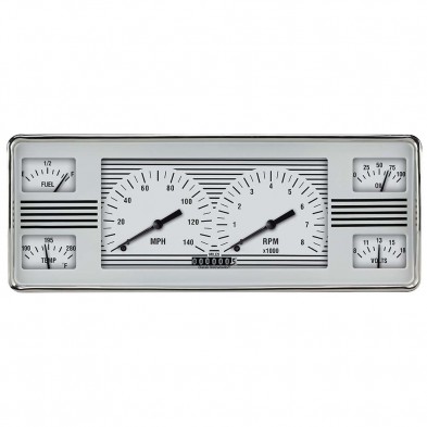 The 1940 Ford Direct-Fit package is available in four different graphic styles which include an Original styled graphics package with additional styles based on the Hot Rod, White Hot, and Nostalgia series of Classic Instruments gauges. Each package includes a Speedometer, Tachometer, Fuel (240-33), Oil, Temp, and Volt gauges in an injection molded ABS housing. LED lighting provides superior illumination for night time driving and is adjustable using the built in dimmer. Green LED Halo turn signals are installed in the left and right sides of the instrument cluster with a red LED Halo high beam indicator at the top of the cluster. The package is finished with a polished stainless steel bezel and glass lens. It comes completely assembled and ready to install with all sending units and necessary mounting hardware.