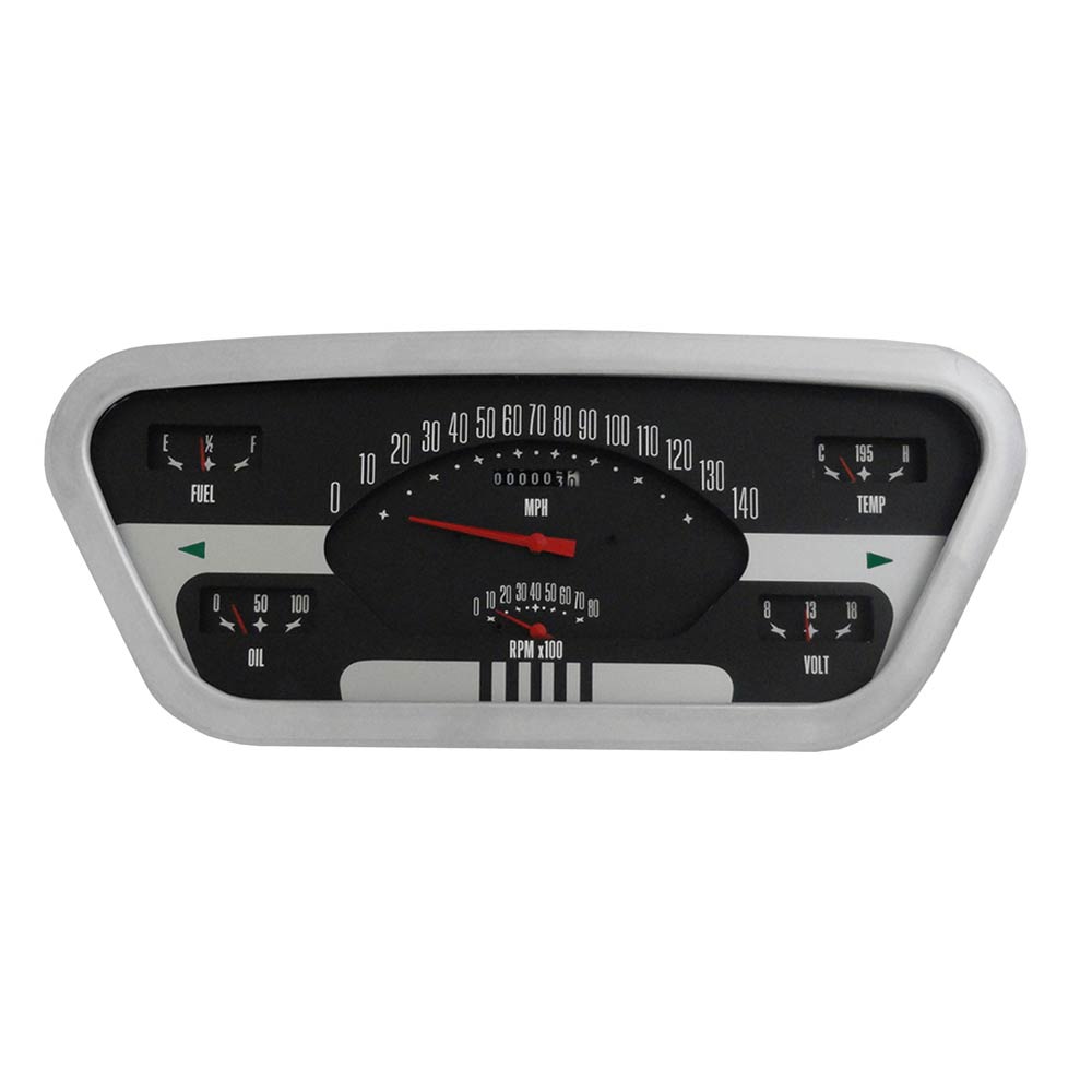 1953-55 Ford F-100 Truck 6-in-One Package in Original Style includes 140 mph Speedometer, 8000 rpm Tachometer, Fuel (75-10 ohm), Oil, Temp and Volt gauges installed in a housing and accented by a machined aluminum bezel. The completely assembled package features push button calibration, LED illumination, integrated turn signals, a blue Halo high beam indicator, built-in ECM filter signal switch, wiring harness, and all necessary sending units.