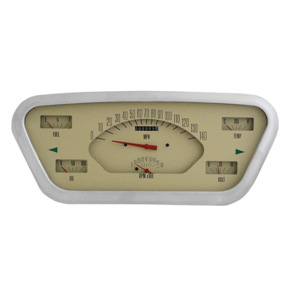 1953-55 Ford F-100 Truck 6-in-One Package with a Tan Face includes 140 mph Speedometer, 8000 rpm Tachometer, Fuel (75-10 ohm), Oil, Temp and Volt gauges installed in a housing and accented by a machined aluminum bezel. The completely assembled package features push button calibration, LED illumination, integrated turn signals, a blue Halo high beam indicator, built-in ECM filter signal switch, wiring harness, and all necessary sending units.