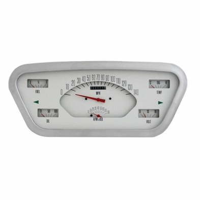 1953-55 Ford F-100 Truck 6-in-One Package with a White Face includes 140 mph Speedometer, 8000 rpm Tachometer, Fuel (75-10 ohm), Oil, Temp and Volt gauges installed in a housing and accented by a machined aluminum bezel. The completely assembled package features push button calibration, LED illumination, integrated turn signals, a blue Halo high beam indicator, built-in ECM filter signal switch, wiring harness, and all necessary sending units.