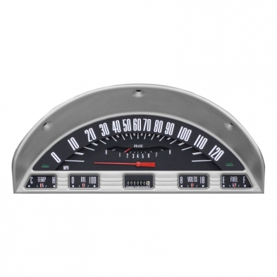 The 1956 Ford F-100 Truck Package Black 6-in-One package includes 120 MPH Speedometer, 8,000 RPM Tachometer, Fuel (75-10 OHM), Oil, Temp, and Volt. The completely assembled unit includes housing, wiring harness and all necessary sending units. Features push button calibration, LED illumination, integrated turn signals and a red Halo high beam indicator.
