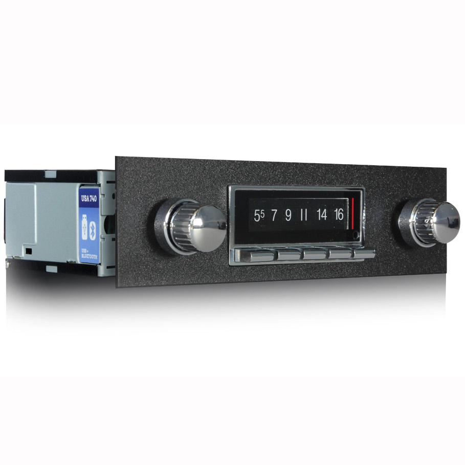 The USA-740 offers the same classic look that Custom Autosound has always been known for with today’s latest features. Now, with built-in Bluetooth (microphone included), answer calls and get Bluetooth streaming music from your Bluetooth capable phone or Bluetooth compatible device. Match the dominant color of your instrument cluster with user selectable multiple LCD color choices with LCD dimmer control. The AM/FM RDS tuner shows station, song and artist on the LCD display. Fully controls optional CD-1 CD player. Classic style with today’s sound and performance taking every road and curve with you in your vintage vehicle.