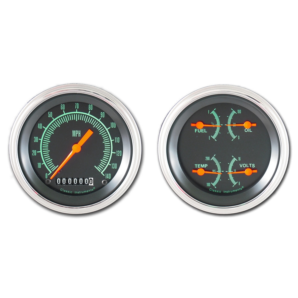 2 Gauge Set: 3-3/8" Speedo, Quad (fuel, oil, temp, & volts), Curved Lens and stainless bezel.