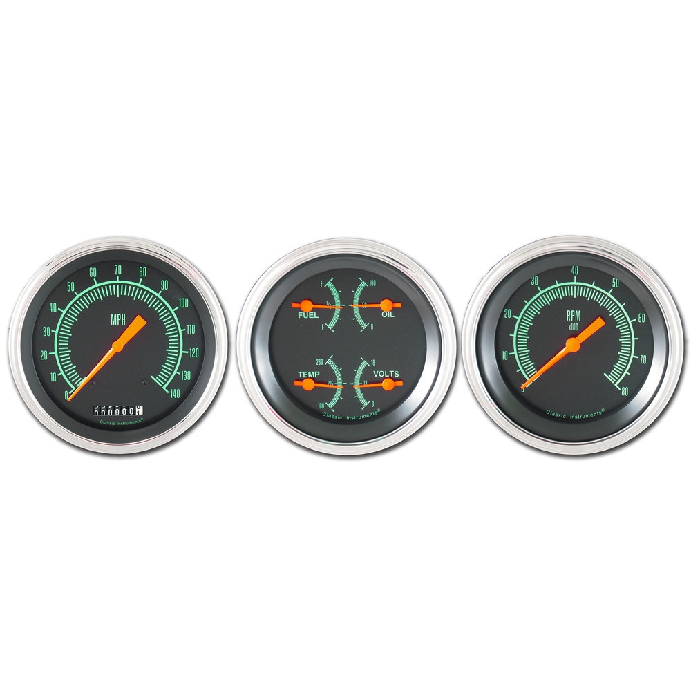 The G-Stock Series 3 Gauge Kit includes a 3-3/8" Speedo, Tach and Quad Gauge (Fuel, Oil, Temp and Volt) with Stainless Low Step Bezel Flat Glass Lens.