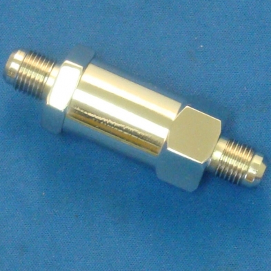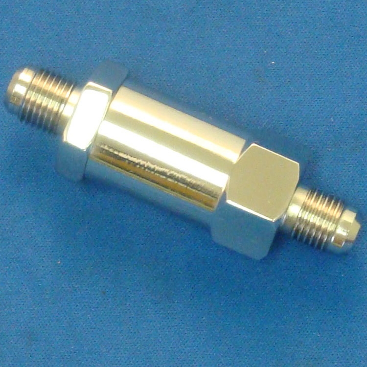 Universal fuel filter with built in check valve in Polished Stainless Steel. Features a -6 AN male hose ends and it uses an OEM GM filter. Please Notenot for use on fuel injected applications.