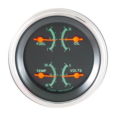 The G-Stock Series 3-3/8" Quad Gauge (Fuel, Oil, Temp and Volt) with Stainless Low Step Bezel Curved Glass Lens.