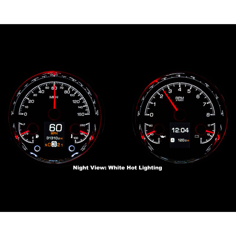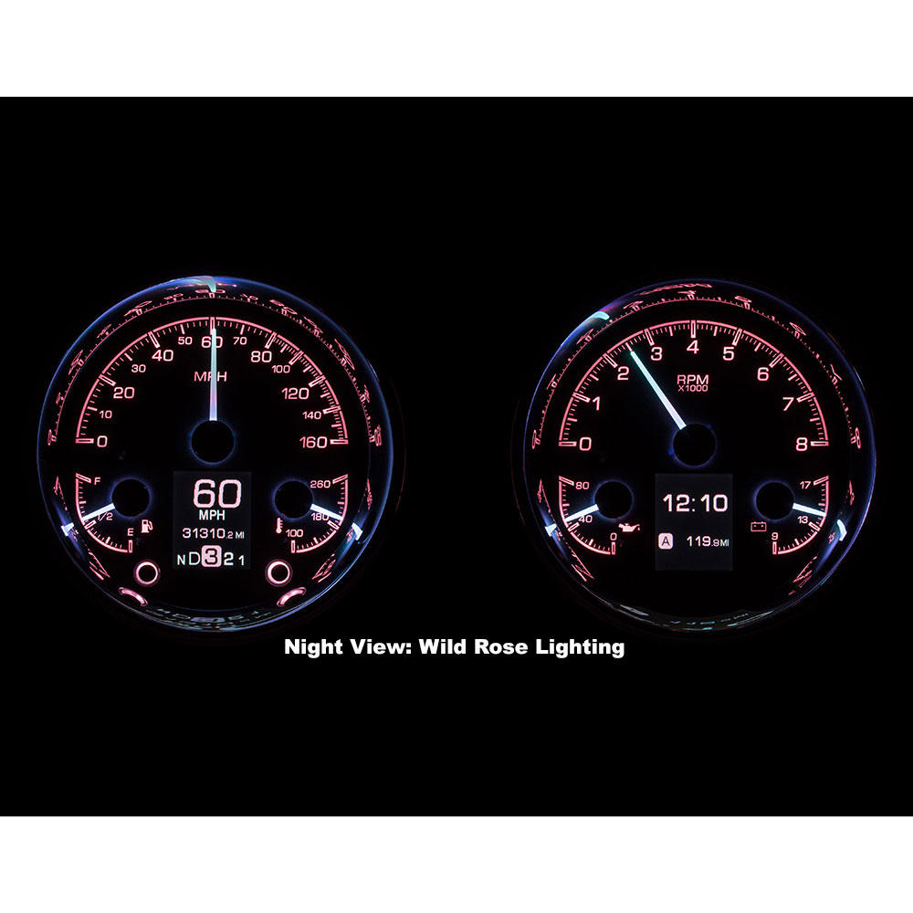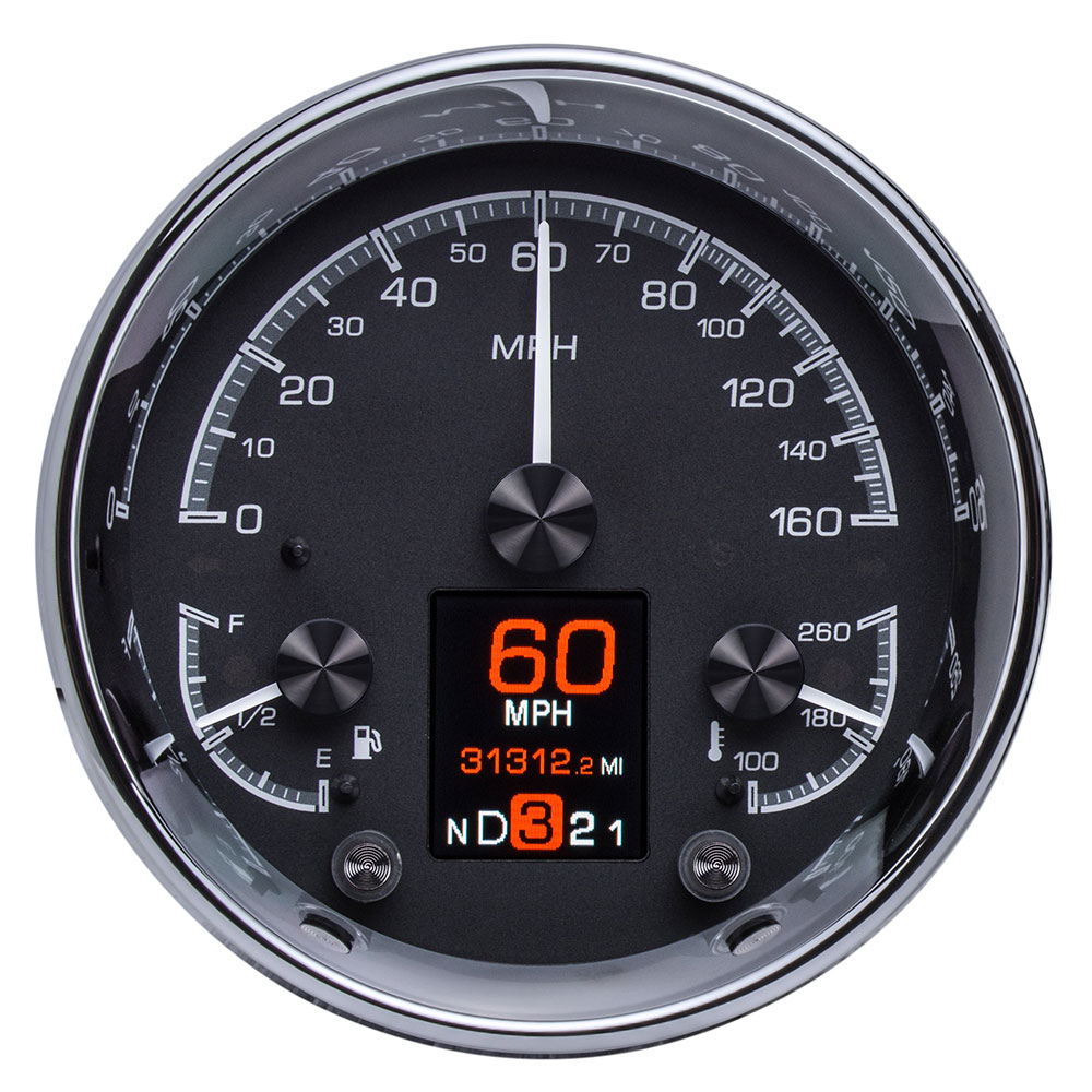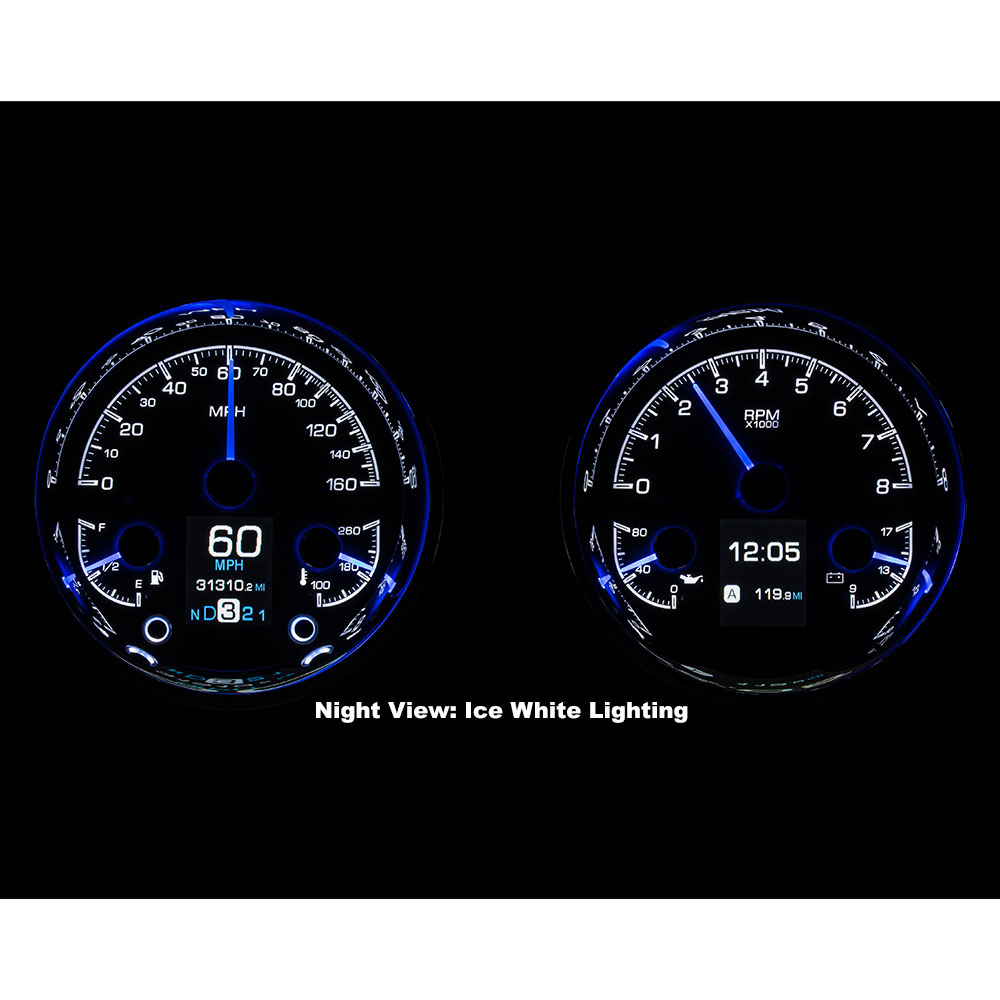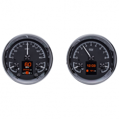 This Dakota Digital gauge kit utilize of pair of 5” round holes, each gauge installs from the front side of your custom dash, and measures 5.4” across. Built-in switches plus one-piece, chrome plated housings/bezels will help this package find its way into a great many applications.