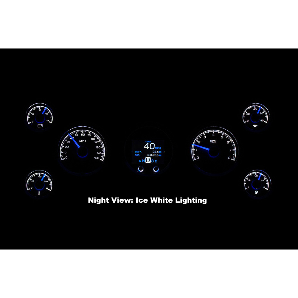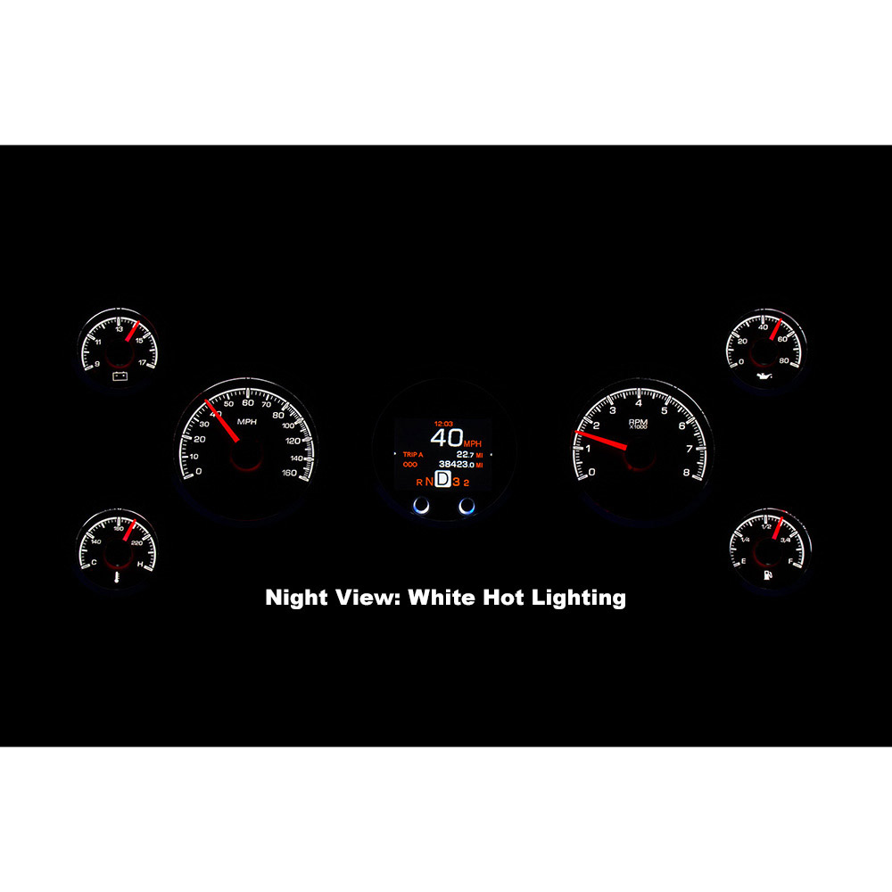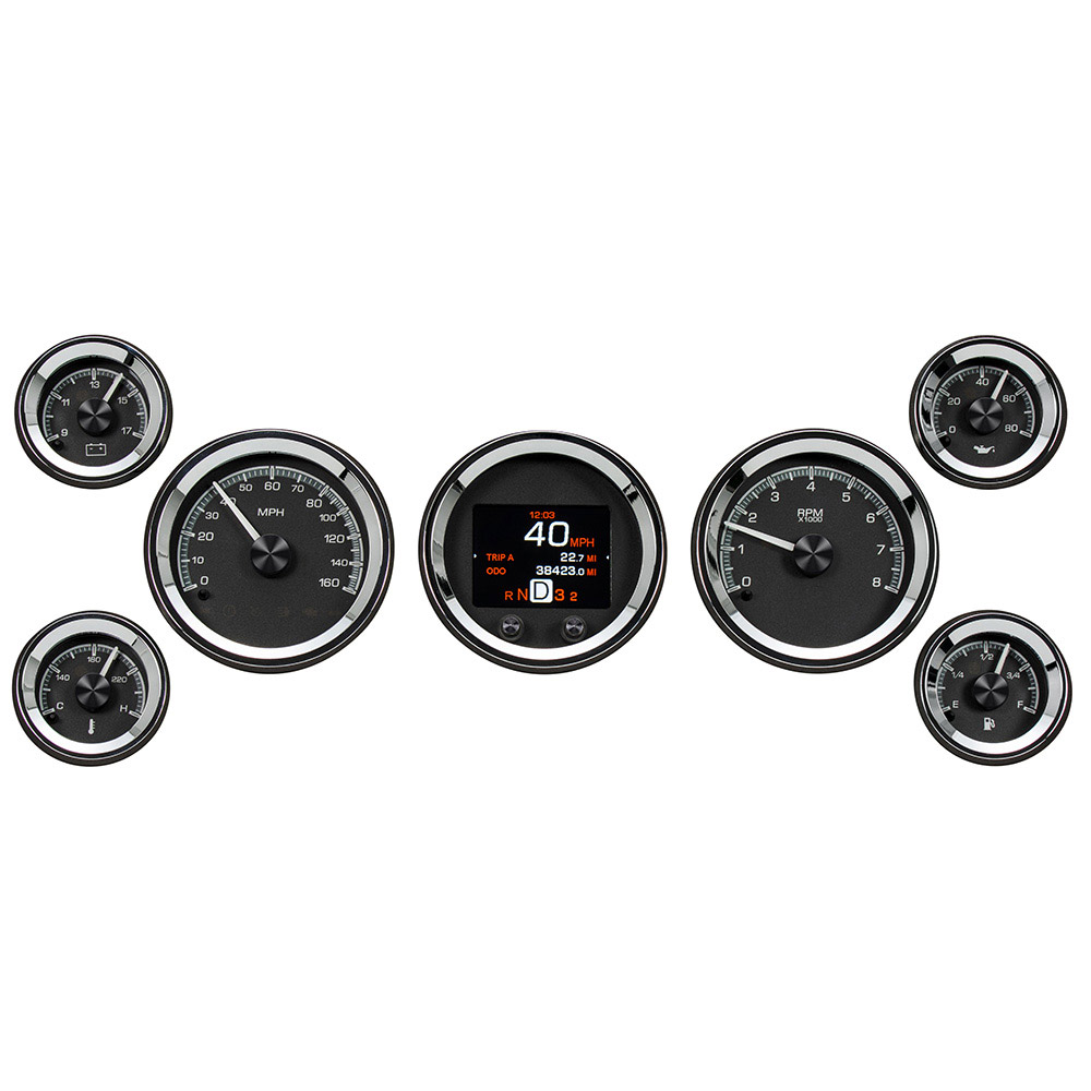 Dakota Digital HDX Gauge Kit. The speedometer/tach and TFT message center each drop into 3 3/8” holes, while their matching satellites spec out at 2 1/16”; these requires 2” of depth behind your panel. Machined mounting cups secure the gauges to your panel, attached with supplied thumb nuts. That full-color TFT message center can display as much information as you like!