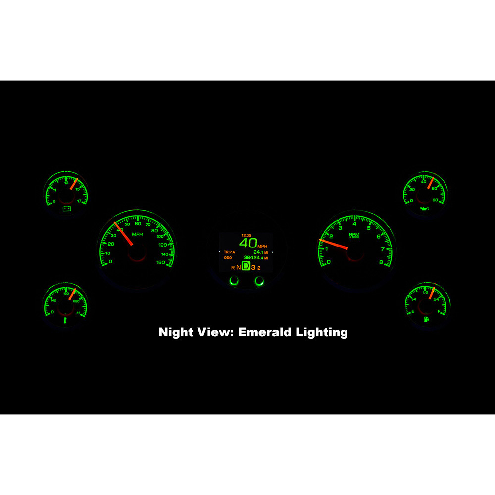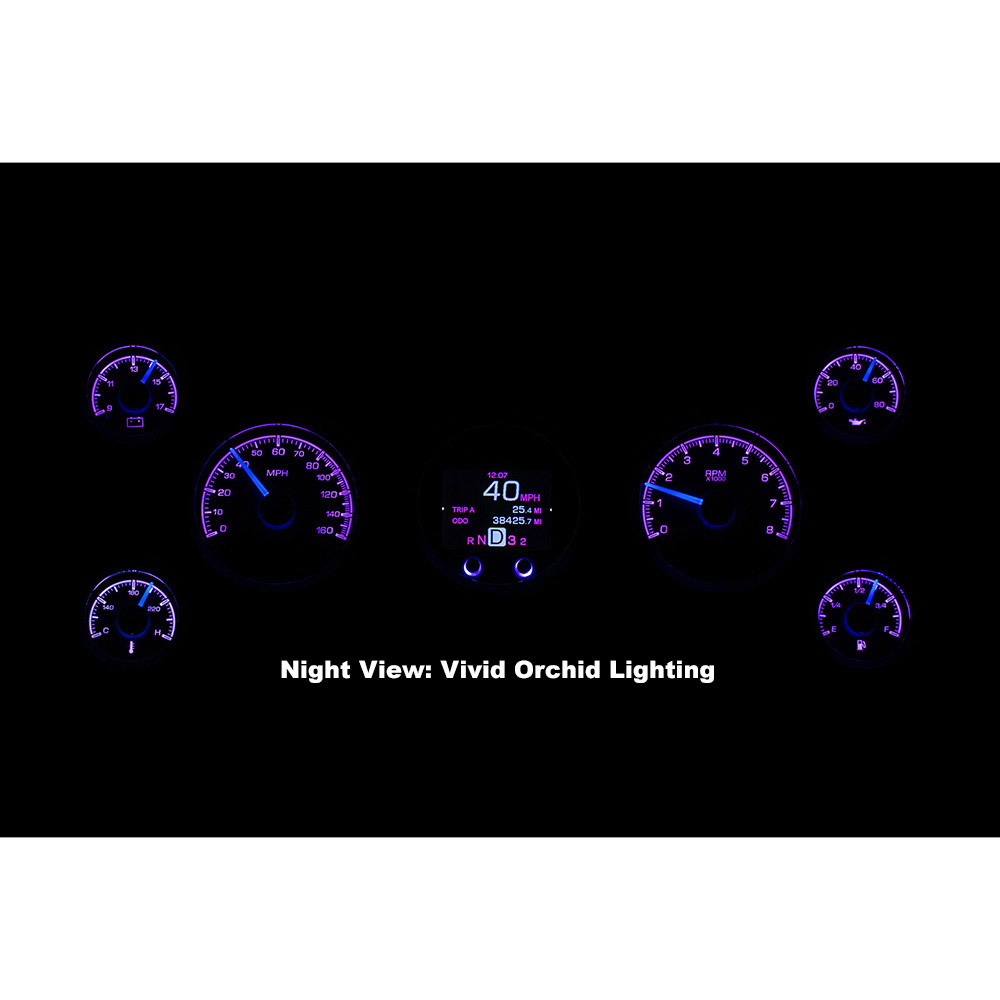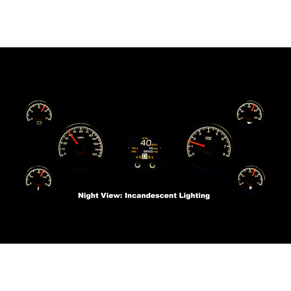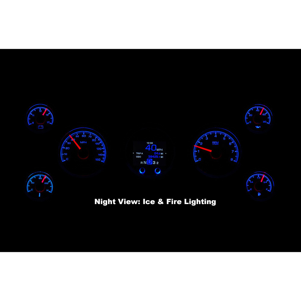 Dakota Digital HDX Gauge Kit. The speedometer/tach and TFT message center each drop into 3 3/8” holes, while their matching satellites spec out at 2 1/16”; these requires 2” of depth behind your panel. Machined mounting cups secure the gauges to your panel, attached with supplied thumb nuts. That full-color TFT message center can display as much information as you like!