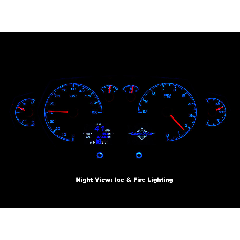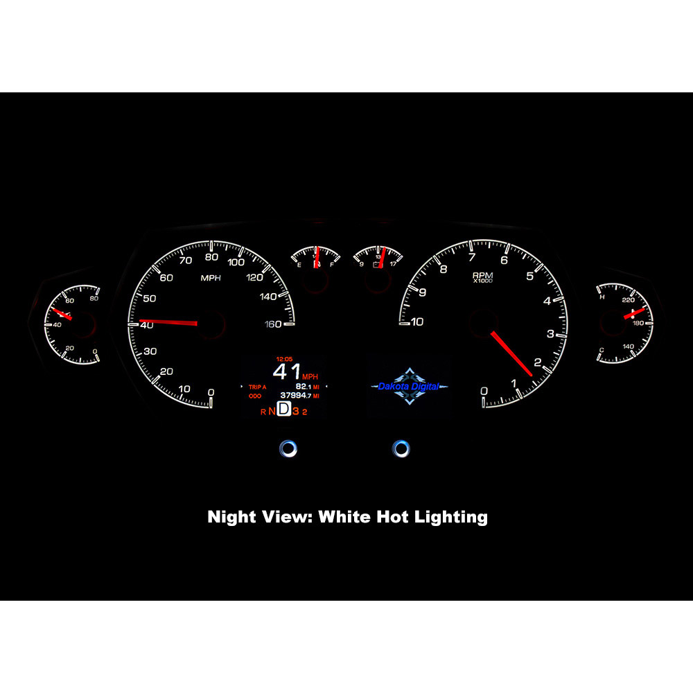 This Dakota Digital gauge kit Requiring 15.10” x 6.25” of flat dash space, this six-gauge system features two large TFT message centers for maximum driver awareness. Ensure you have 2” of clearance behind the 14.60” x 5.83” cutout. Billet aluminum bezel is powder coated in matte black, and the capacitive-touch programming switches are set just below the TFTs.