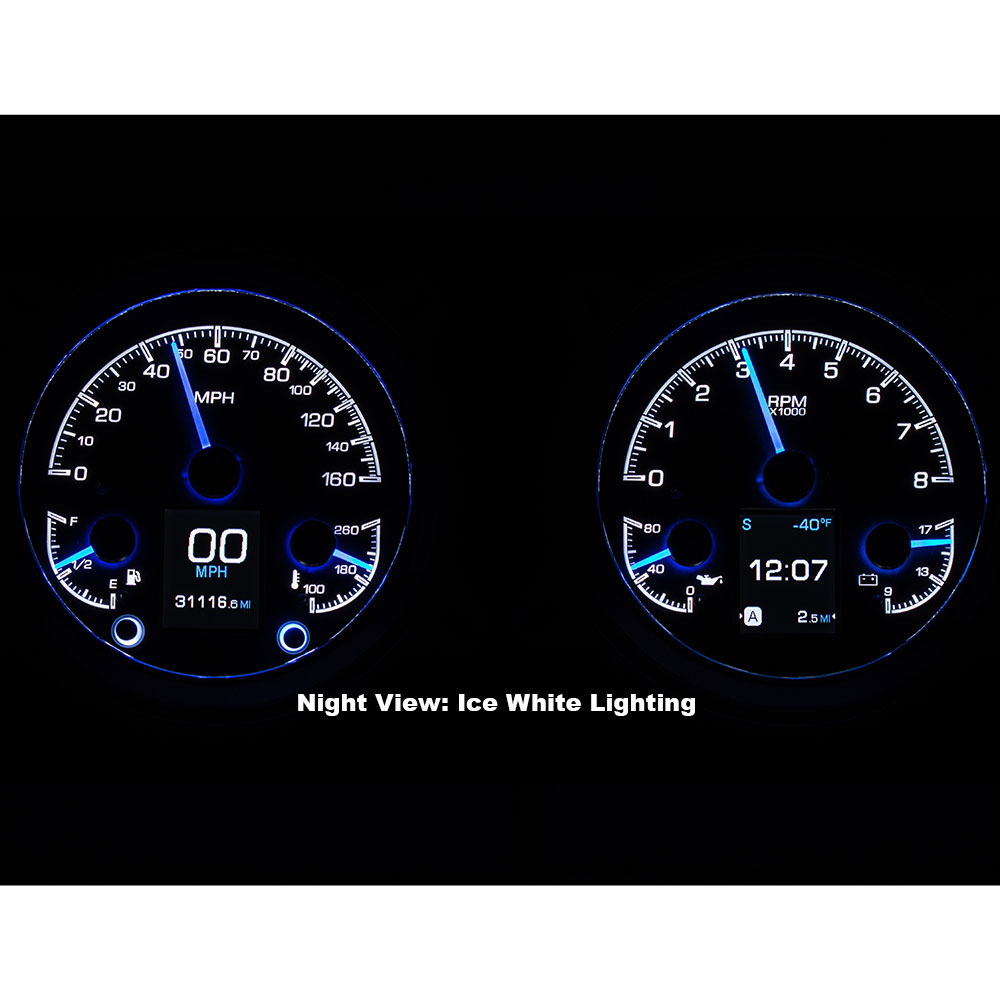 Available in two color options of black or silver alloy gauge-face styling, each HDX system allows the user to select and change their favorite illumination color for the gauge readings and needles, as well as the TFT message center displays. Red, Green, Blue LEDs are incorporated into the circuit boards for fully-adjustable display colors (over 30 color options), allowing the user to personalize their gauge lighting to match nearly any vehicle theme.