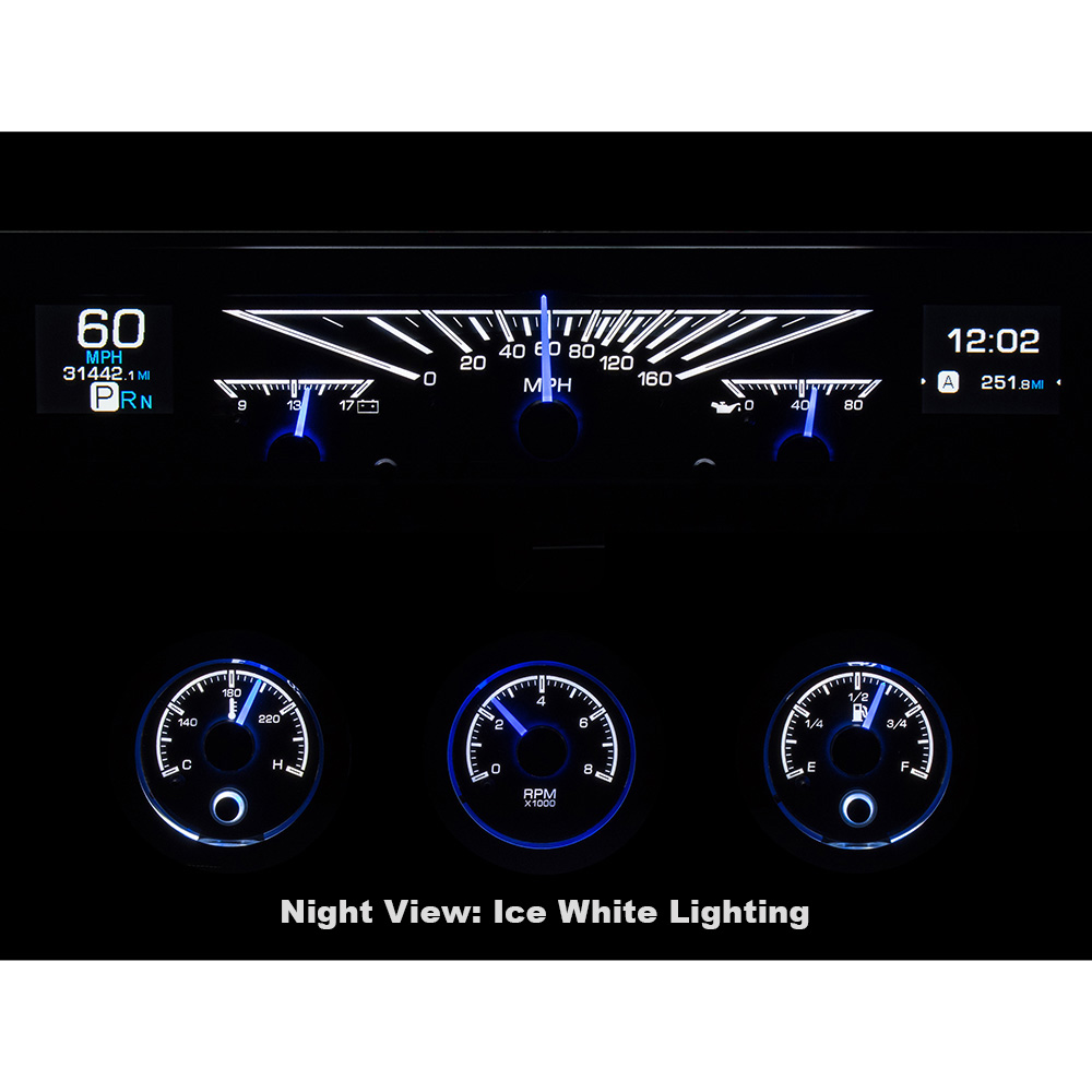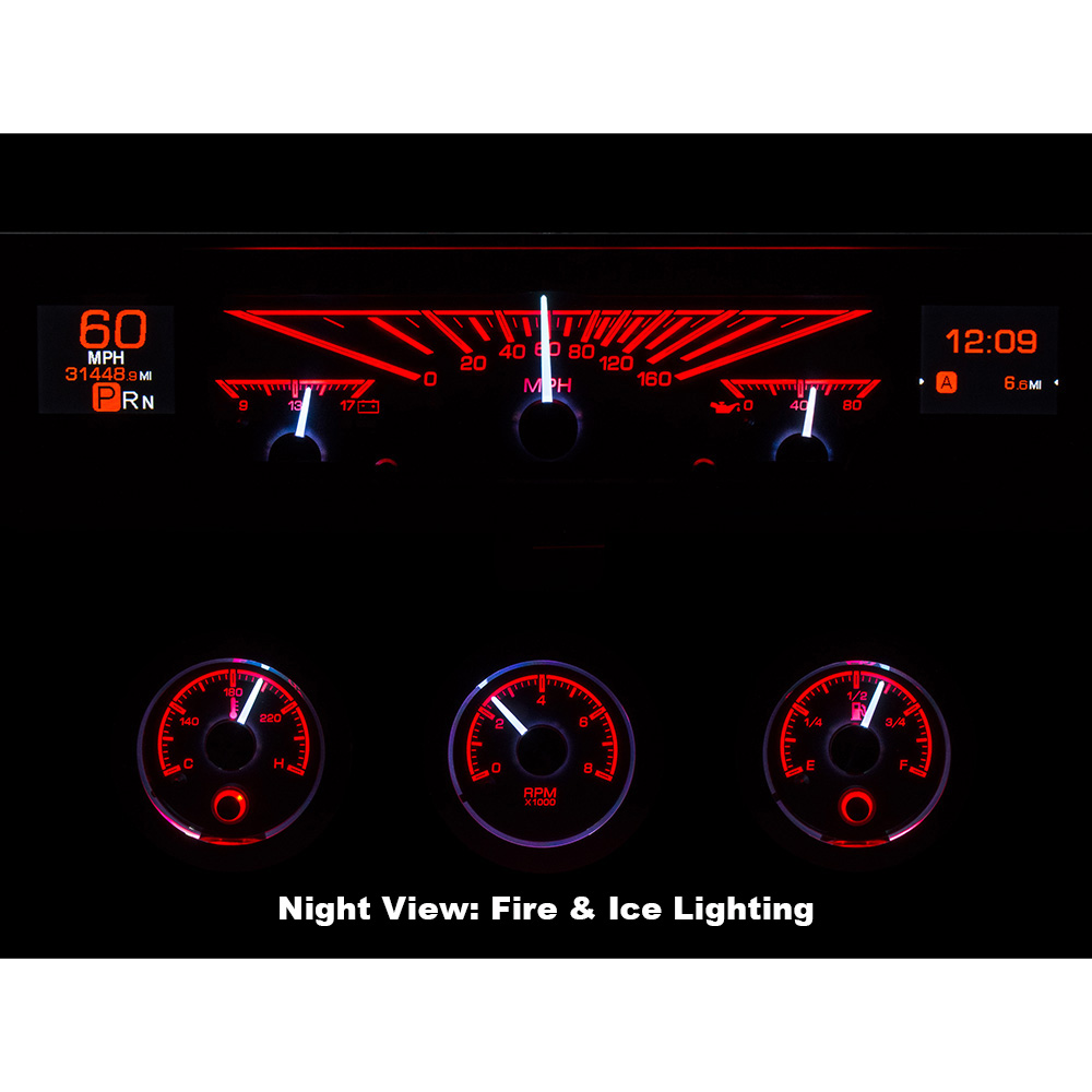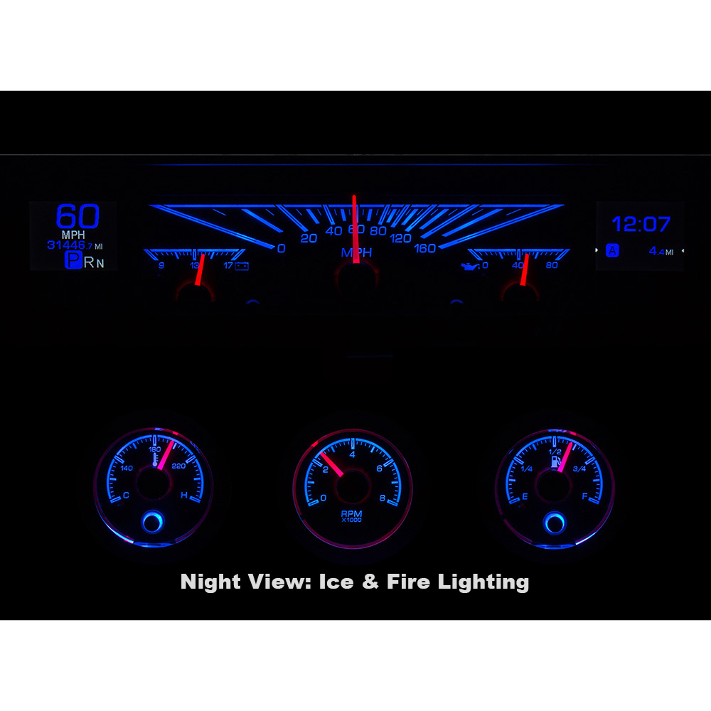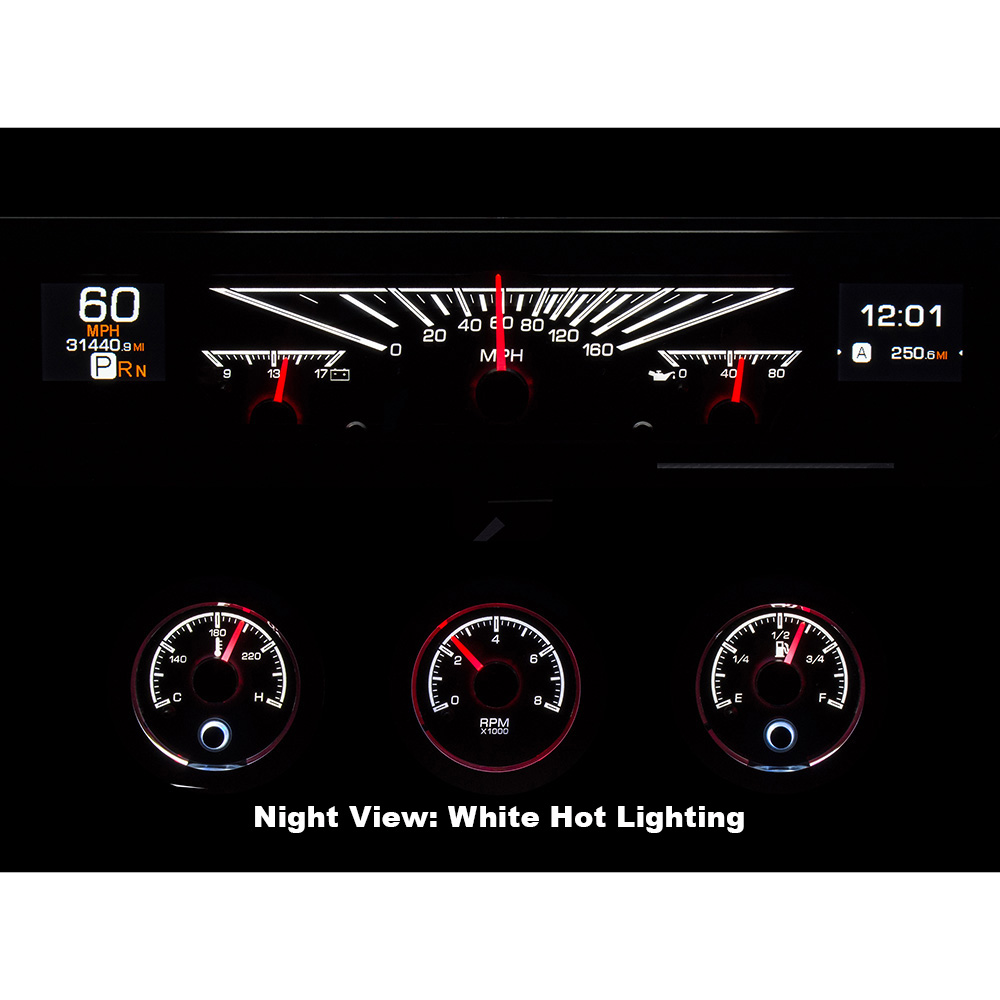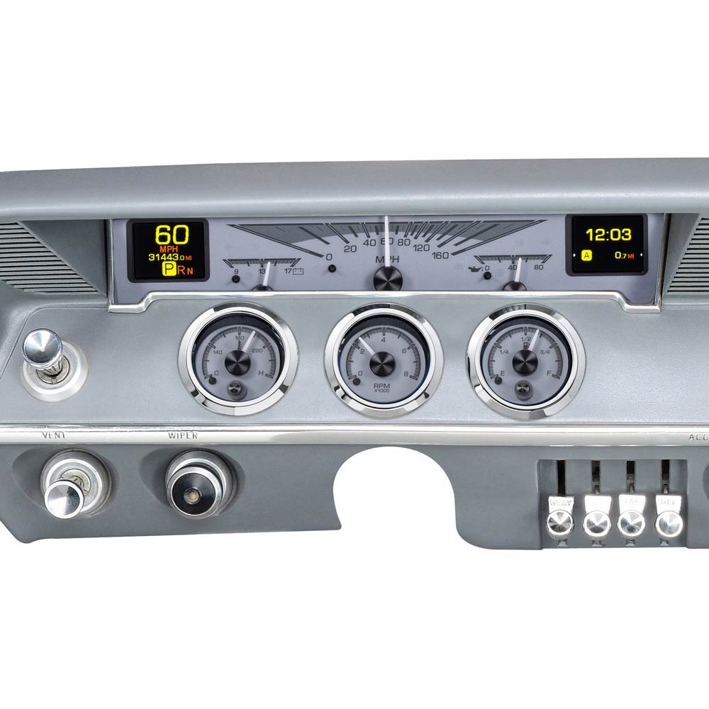 This Dakota Digital HDX gauge kit offers a little something for everyone, with its twin TFT message centers, easy, direct-fit installation and new chrome bezels /housings for the round gauges. Kit uses your original rectangle speedometer trim. Available with black or silver face styling.