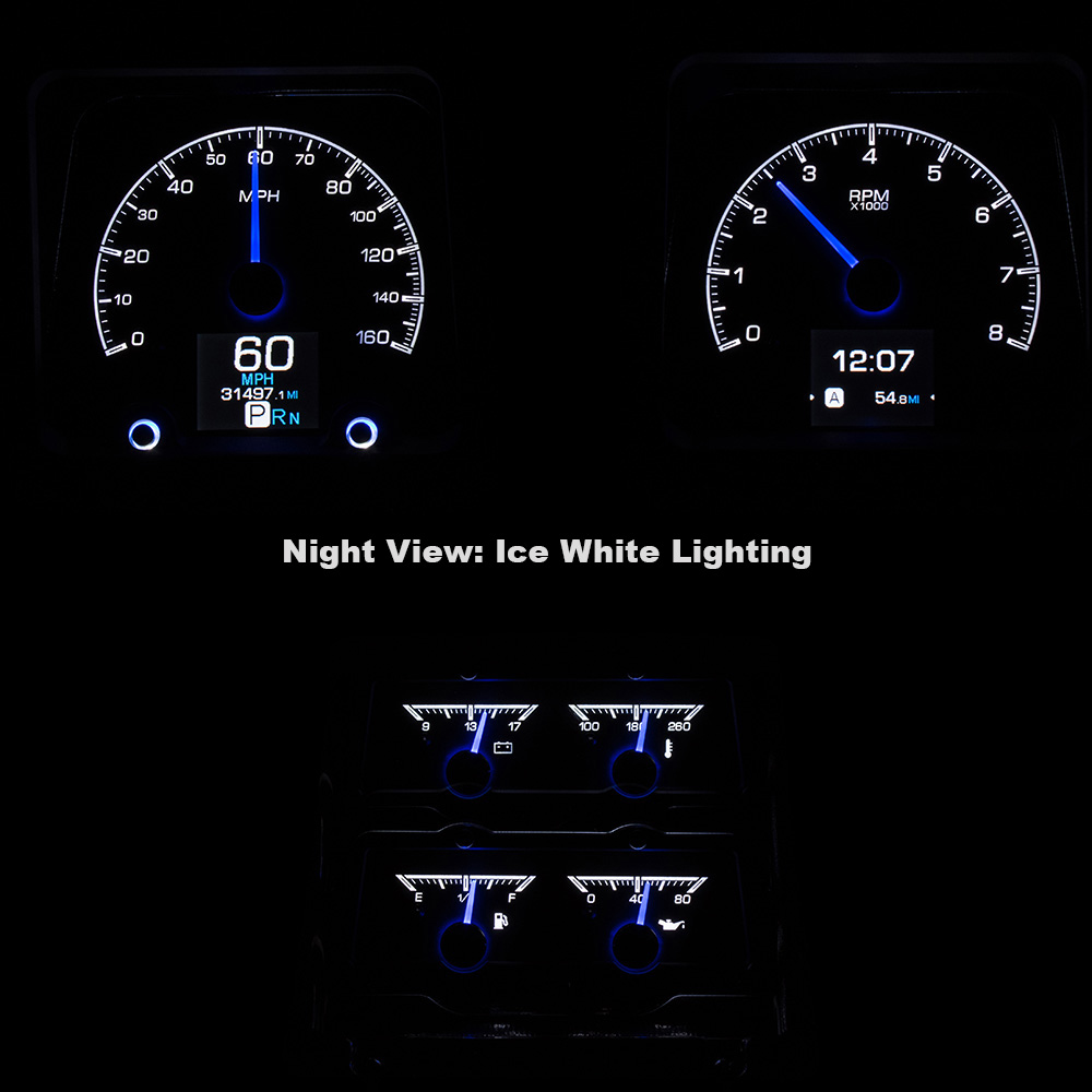 This Dakota Digital HDX gauge kit is available in black or silver alloy gauge-face styling, each HDX system allows you to select independent illumination colors for the gauge readings and needles, as well as the message centers. Calibration and personal settings are manipulated with the built-in, capacitive-touch buttons, or the available Bluetooth app for Apple and Android devices. Each needle hub is black nickel plated spun-aluminum to match the buttons.