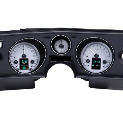 This Dakota Digital HDX kit fits directly into your original or reproduction 1969 Chevelle, Malibu or El Camino instrument housing! With three analog needles and a full-color TFT message center in each large opening. Choose from Black or Silver Alloy face styling. You get a full six-gauge system, including billet trim rings and TFT-display message centers, that’s ready to bolt into a stock or reproduction plastic housing.