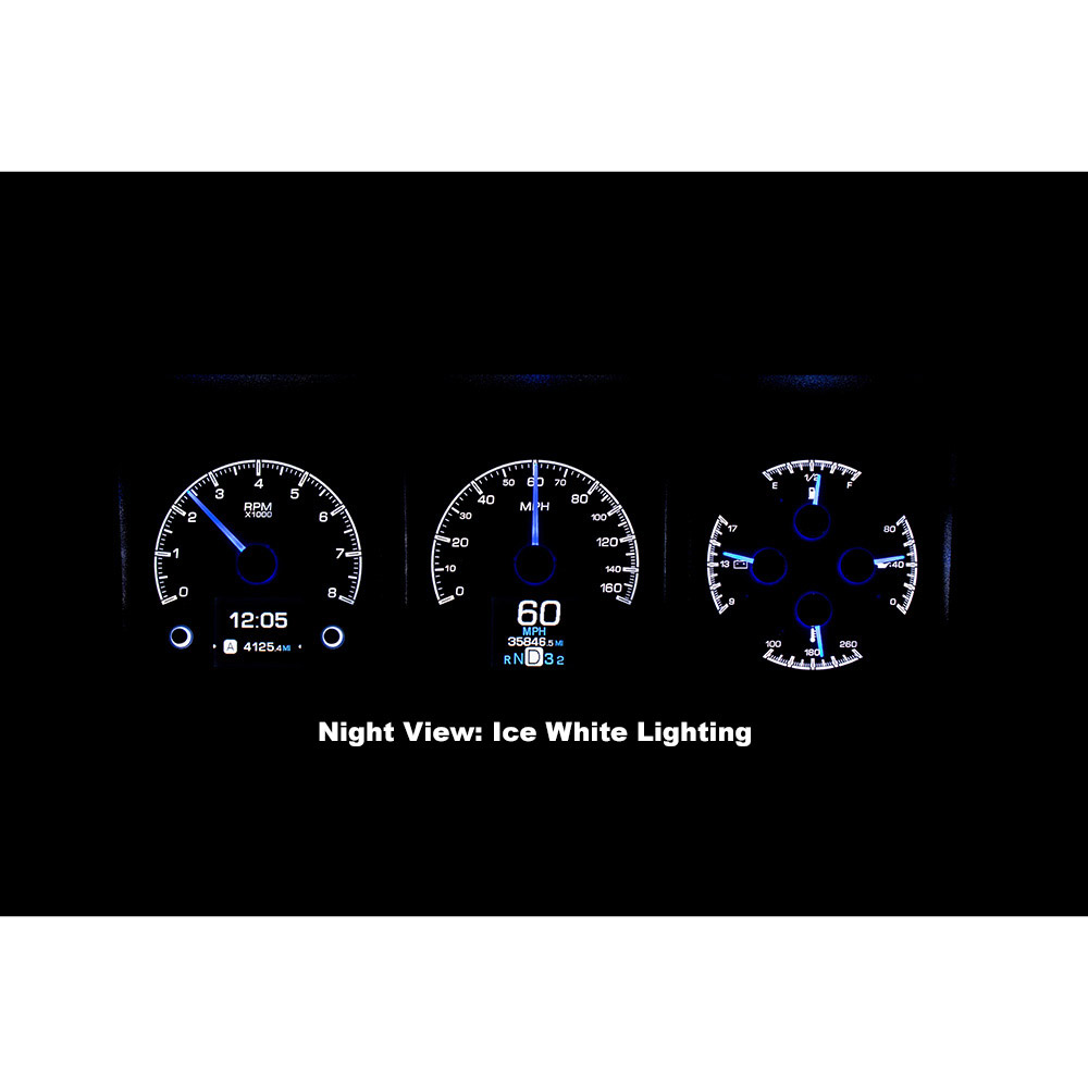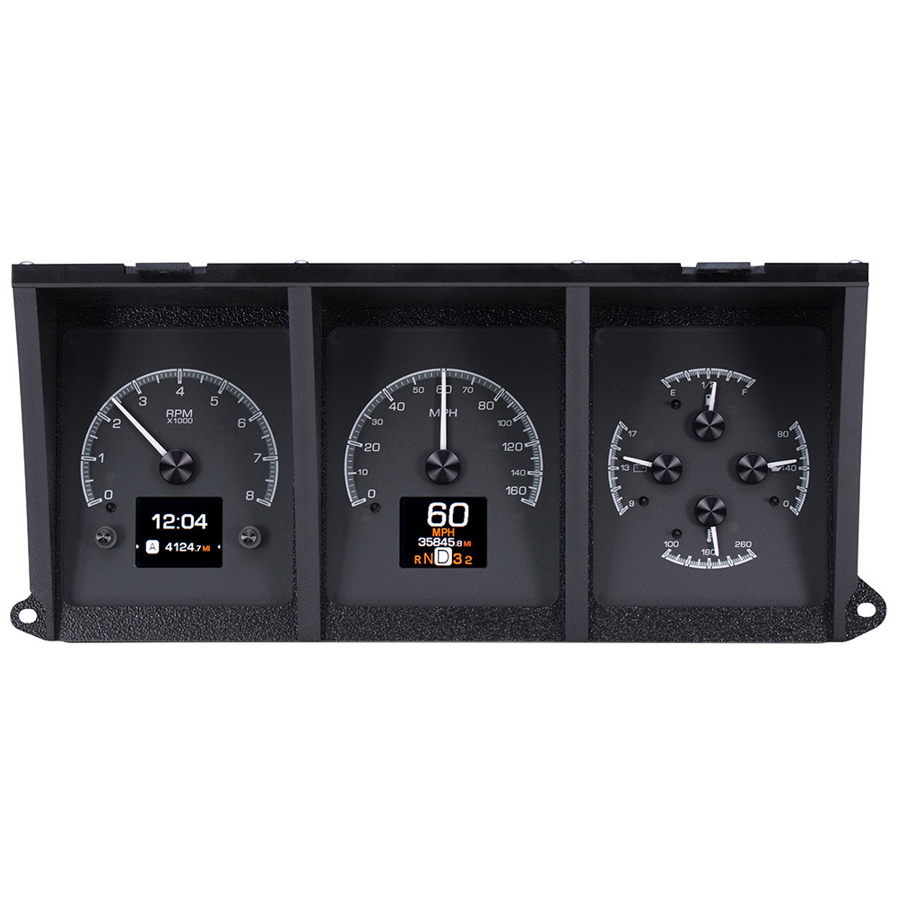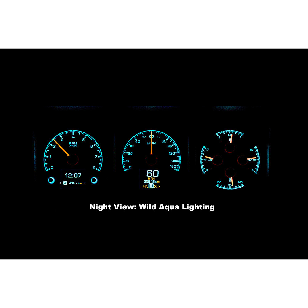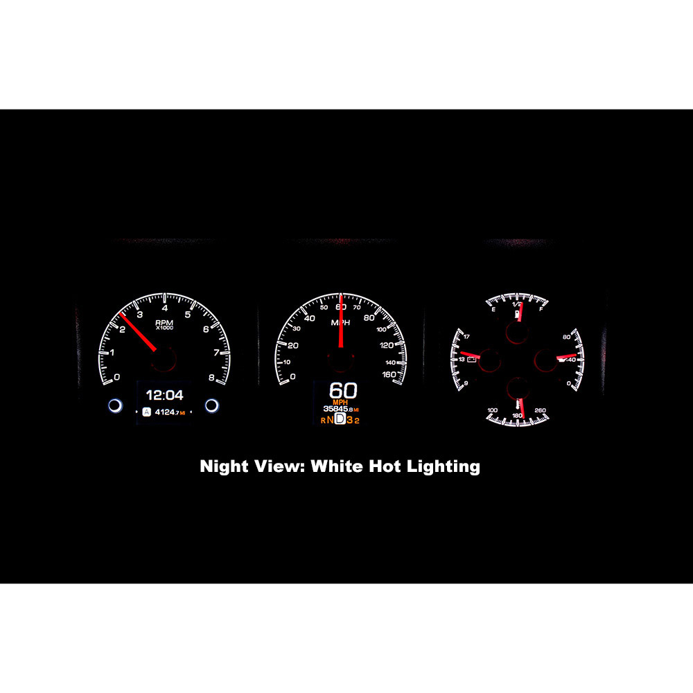 This Dakota Digital gauge kit is available with black or silver alloy gauge-face styling, each HDX system allows you to select independent illumination colors for the gauge readings and needles, as well as the message centers. Calibration and personal settings are controlled with the built-in, capacitive-touch buttons. Each needle hub is black nickel plated spun-aluminum to match the buttons. All HDX instrument systems feature dead-faced indicators (turn signals, high beam, check engine, cruise control, parking brake, plus two user-definable), and a red, settable warning light for each gauge.