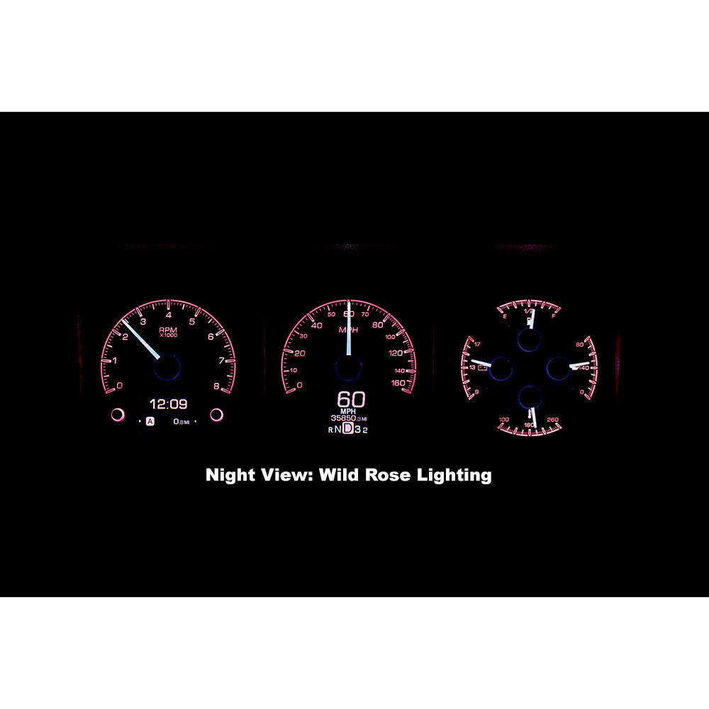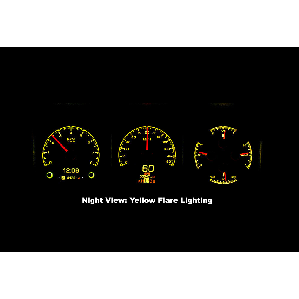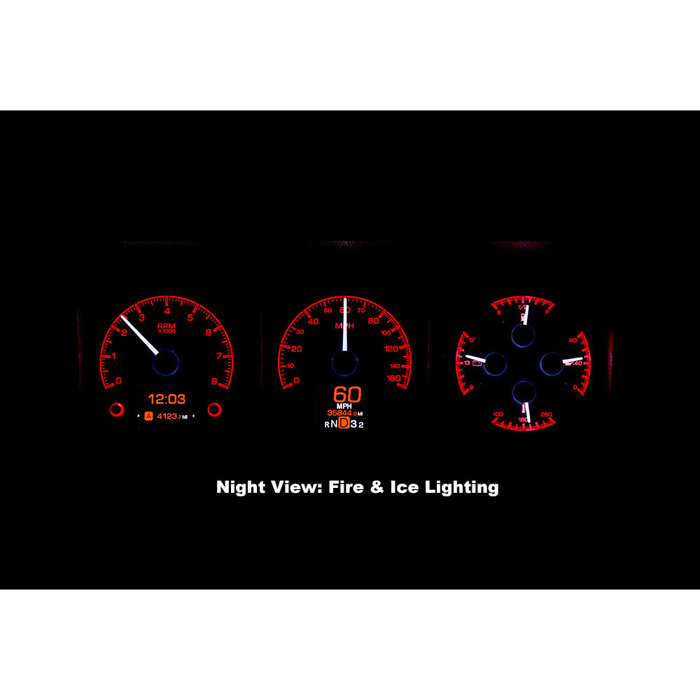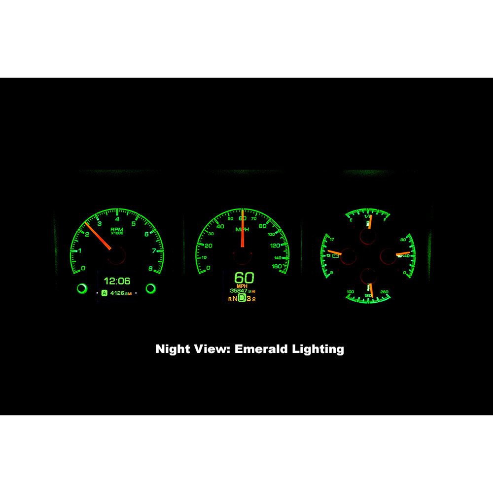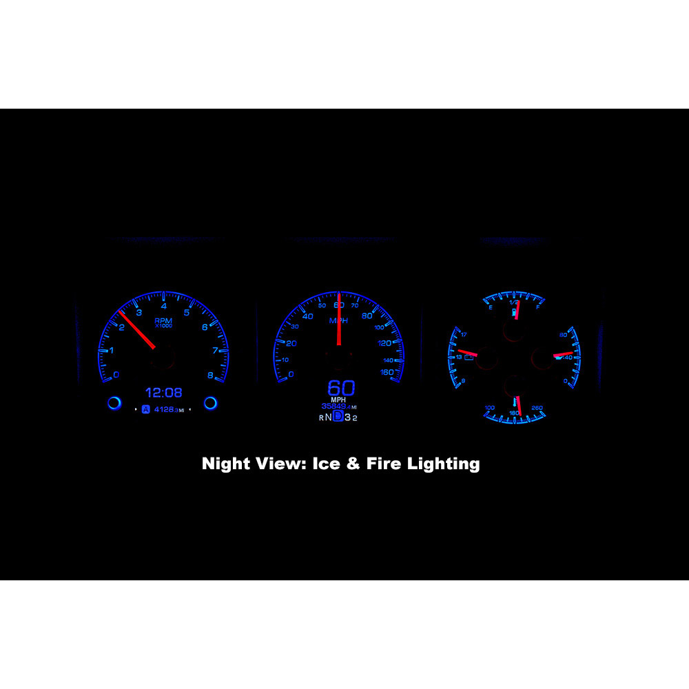 This Dakota Digital gauge kit is available with black or silver alloy gauge-face styling, each HDX system allows you to select independent illumination colors for the gauge readings and needles, as well as the message centers. Calibration and personal settings are controlled with the built-in, capacitive-touch buttons. Each needle hub is black nickel plated spun-aluminum to match the buttons. All HDX instrument systems feature dead-faced indicators (turn signals, high beam, check engine, cruise control, parking brake, plus two user-definable), and a red, settable warning light for each gauge.