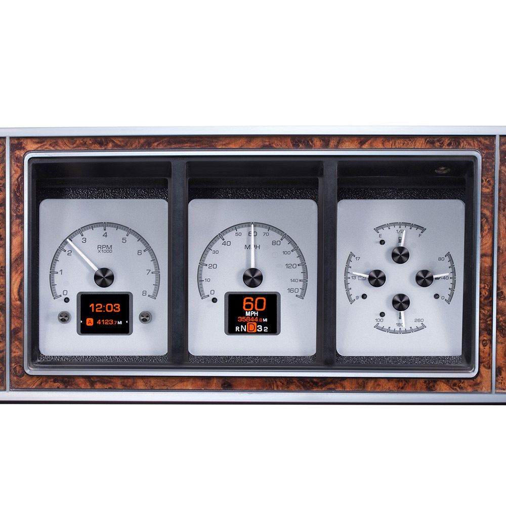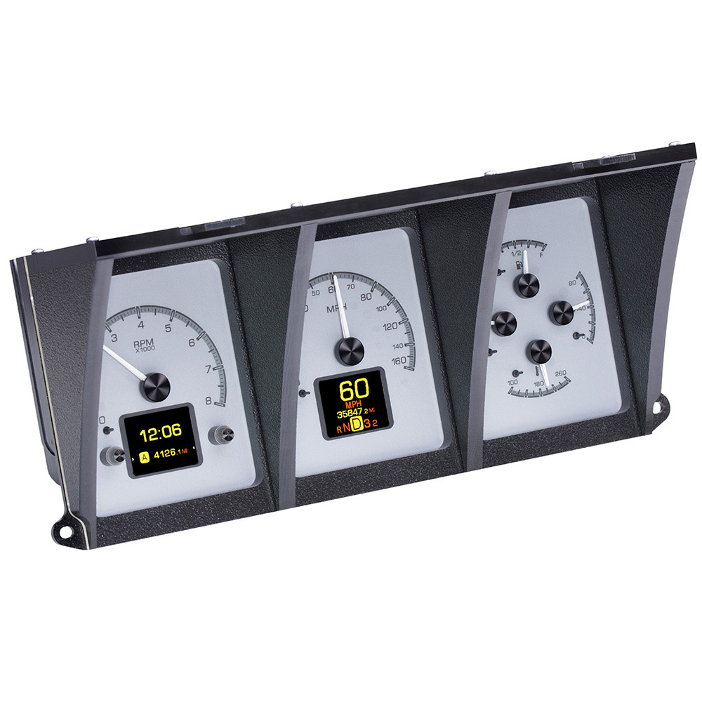 This Dakota Digital gauge kit is available with black or silver alloy gauge-face styling, each HDX system allows you to select independent illumination colors for the gauge readings and needles, as well as the message centers. Calibration and personal settings are controlled with the built-in, capacitive-touch buttons. Each needle hub is black nickel plated spun-aluminum to match the buttons. All HDX instrument systems feature dead-faced indicators (turn signals, high beam, check engine, cruise control, parking brake, plus two user-definable), and a red, settable warning light for each gauge.