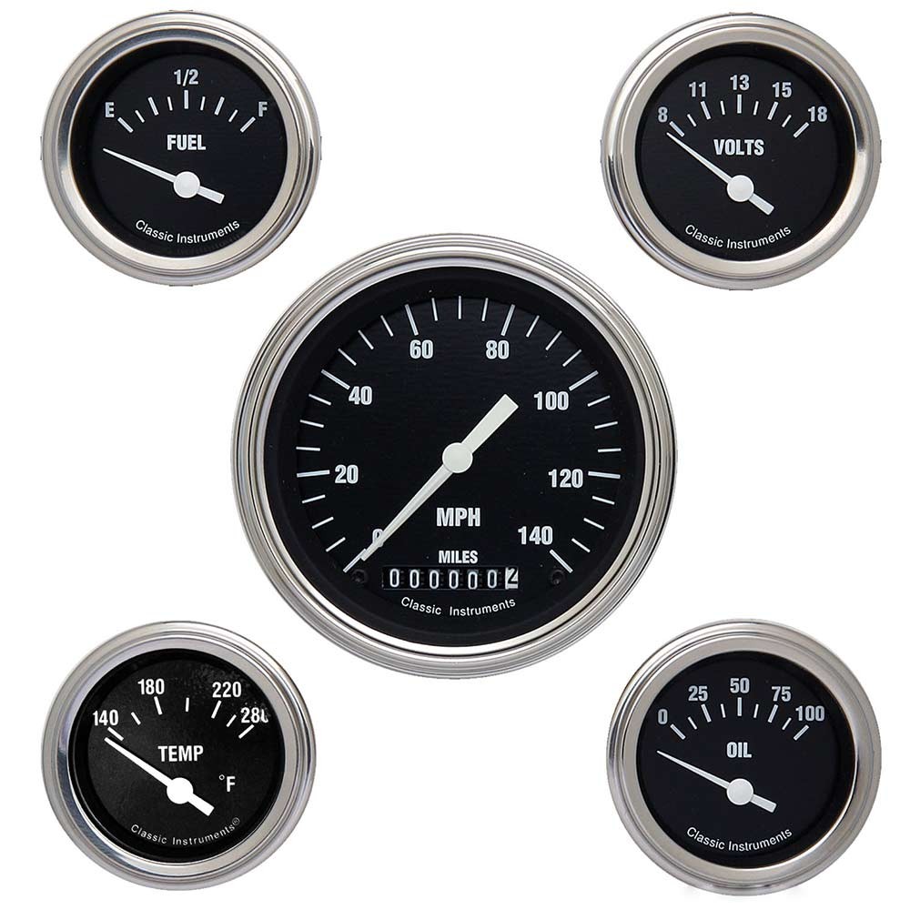 The Hot Rods Series 5 Gauge Kit includes 3-3/8" Speedo and 2-1/8" Fuel, Oil, Temp and Volt gauges with Stainless Low Step Bezel Curved Glass Lens.