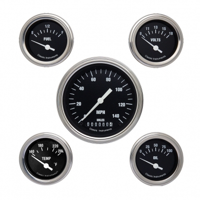 The Hot Rods Series 5 Gauge Kit includes 3-3/8" Speedo and 2-1/8" Fuel, Oil, Temp and Volt gauges with Stainless Low Step Bezel Flat Glass Lens.