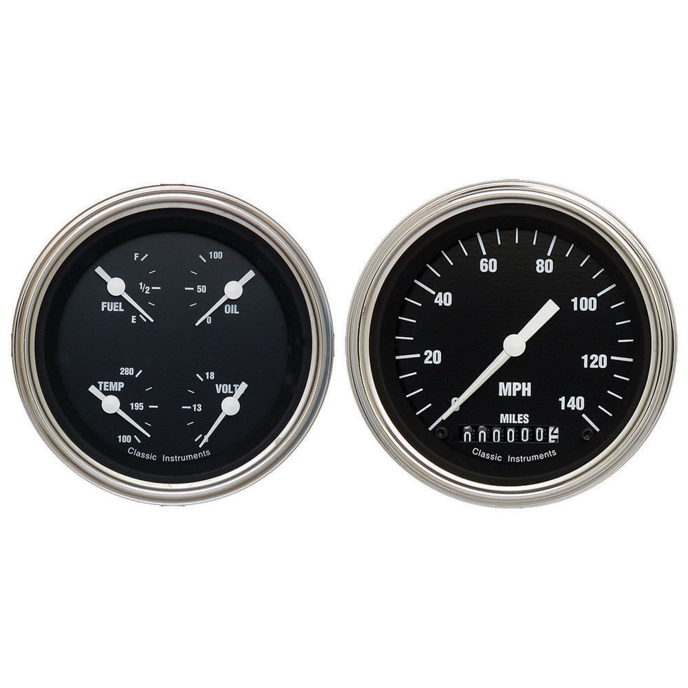 The Hot Rods Series 2 Gauge Kit includes 3-3/8" Speedometer and Quad Gauges (Fuel and Oil plus Temp and Volt) with Stainless Low Step Bezels and Curved Glass Lens.