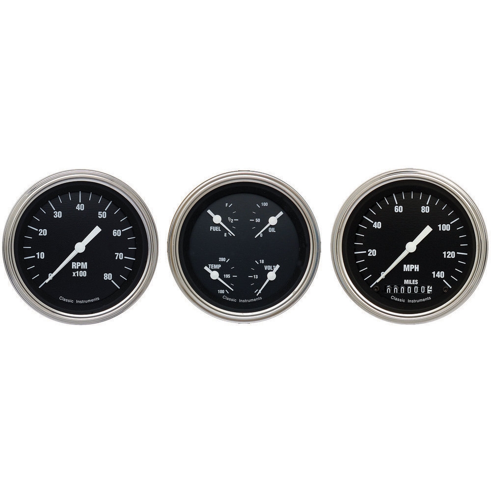 The Hot Rods Series 3 Gauge Kit includes 3-3/8" Speedo, Tach and Quad Gauges with Fuel, Oil, Temp and Volt Gauges with Stainless Low Step Bezels and Curved Glass Lens.