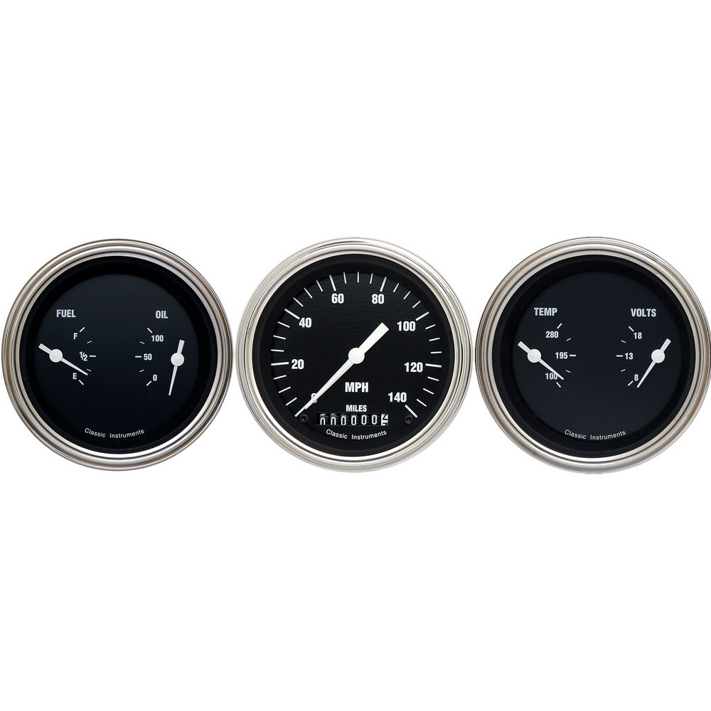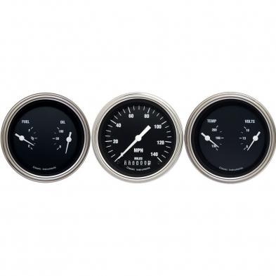 The Hot Rods Series 3 Gauge Kit includes 3-3/8" Speedometer and 2 3-3/8" Dual Gauges (Fuel and Oil plus Temp and Volt with Stainless Low Step Bezels and Curved Glass Lens.